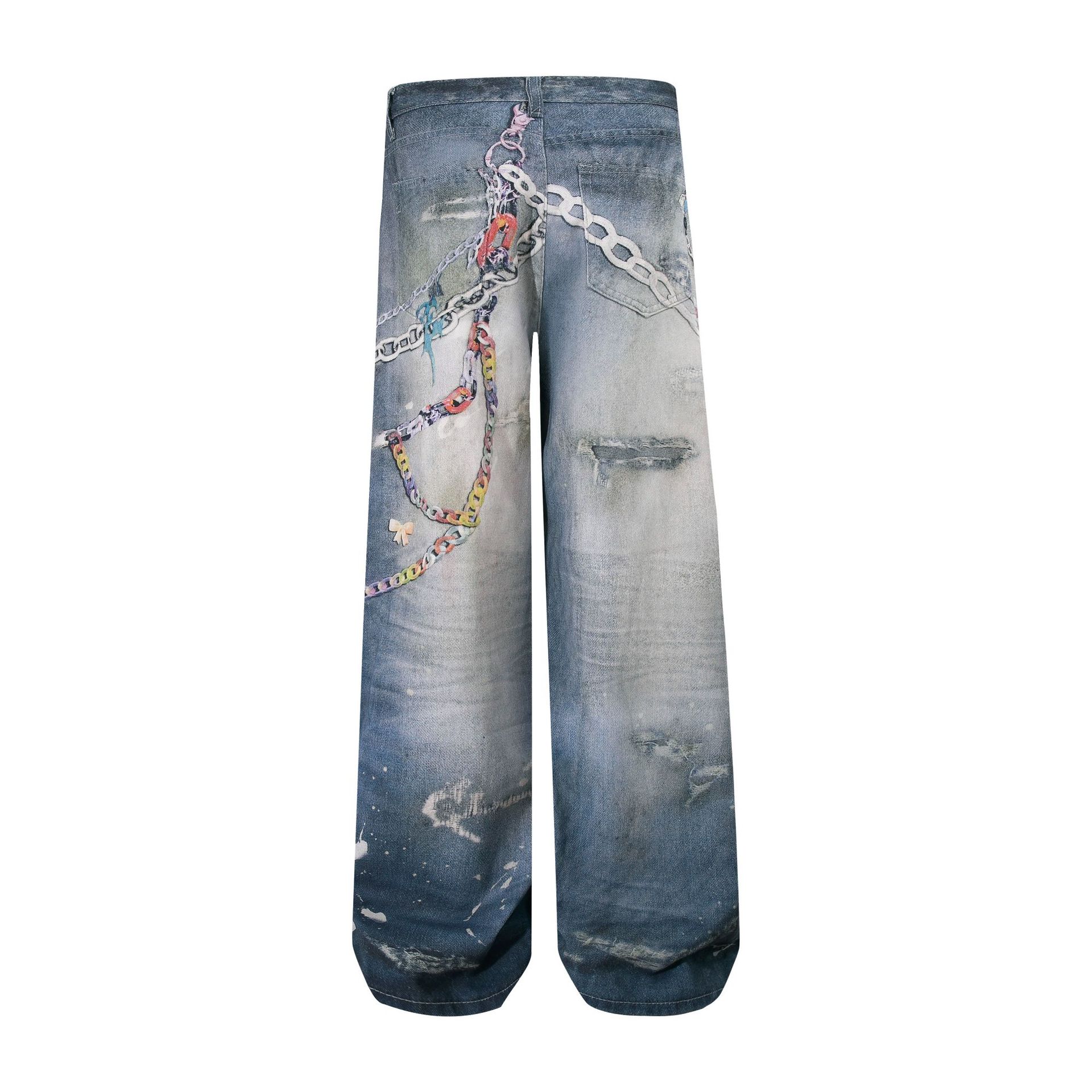 아메리칸 레트로 올드 웨이스트랜드 스타일 3D 프린트 체인 청바지 소년 하이 스트리트 패션 브랜드 루즈 와이드 레그 바닥 길이 바지