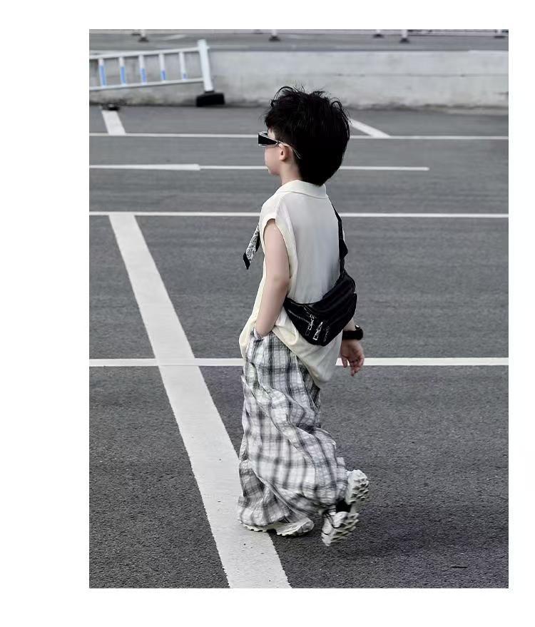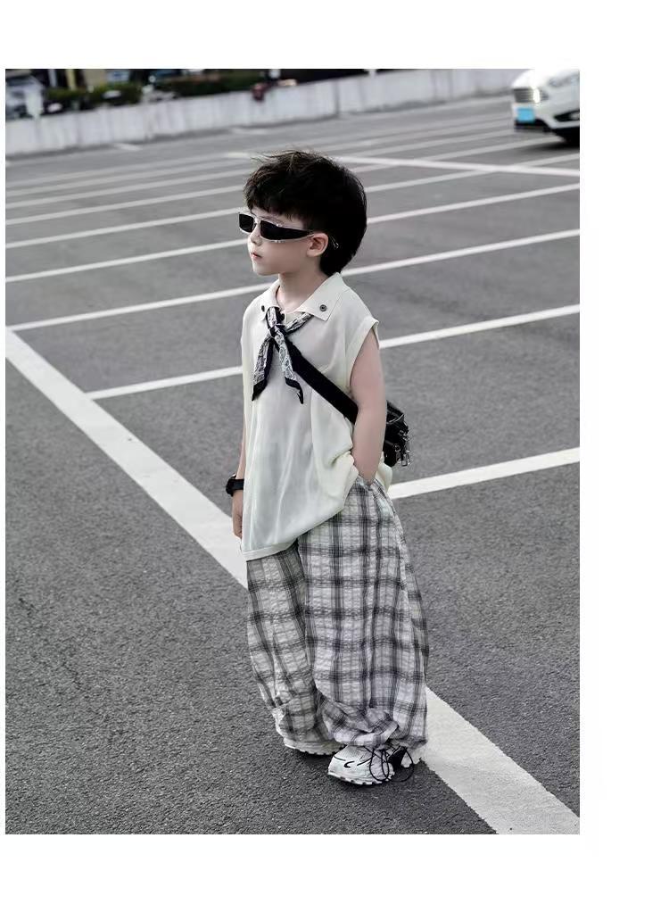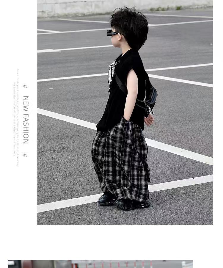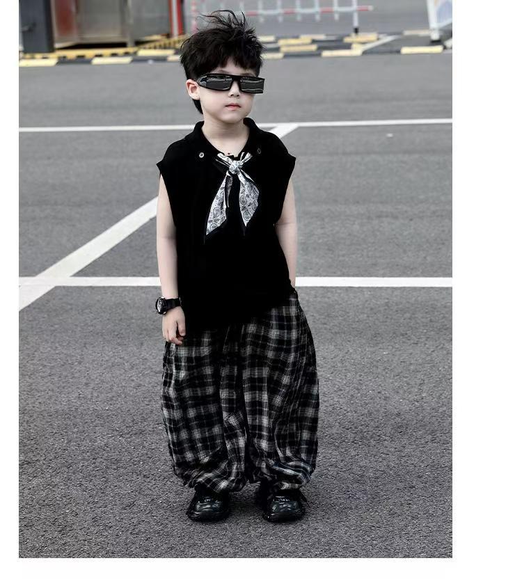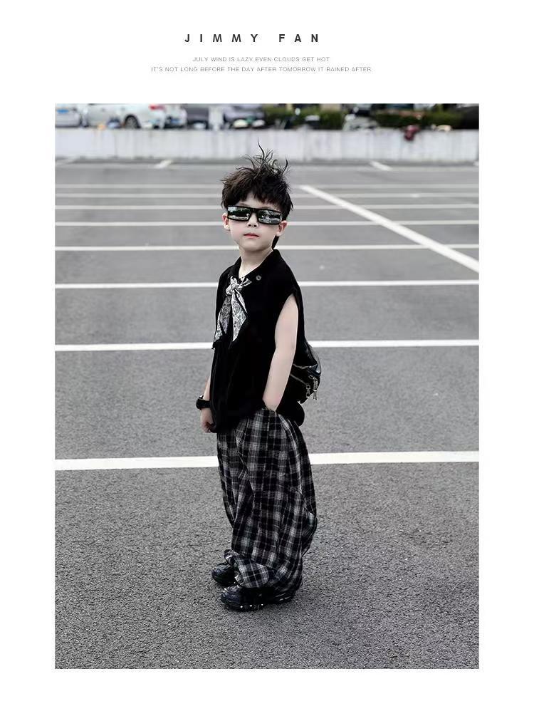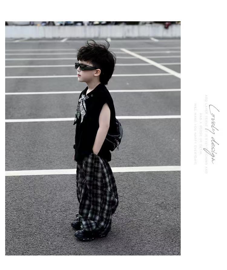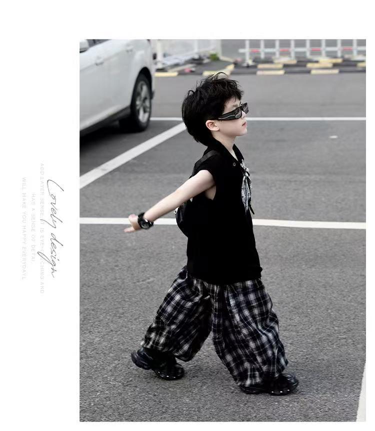 소년 여름 민소매 양복 2025 새로운 여름 어린이 얇은 탑 격자 무늬 바지 서양식 어린 소년 옷스토어 가기