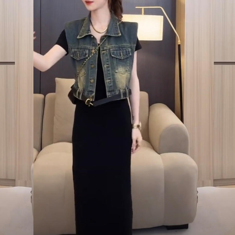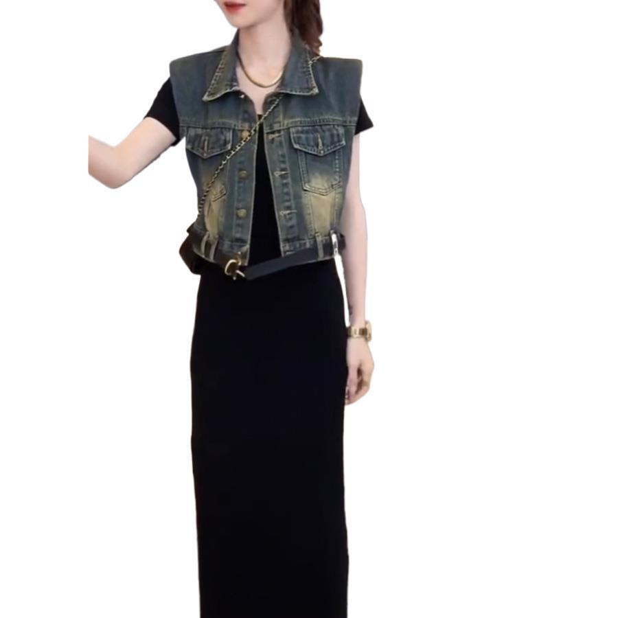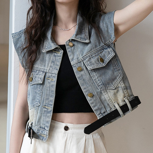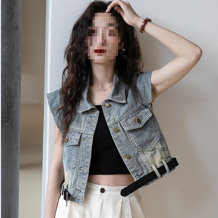 [무료 벨트] 디자인 데님 조끼 여성 여름 신작 루즈 조끼 짧은 코트스토어 가기