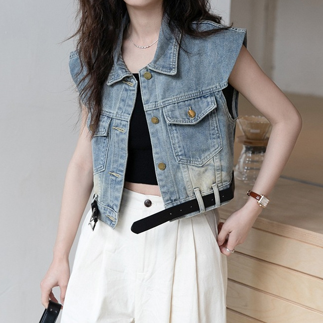 [무료 벨트] 디자인 데님 조끼 여성 여름 신작 루즈 조끼 짧은 코트