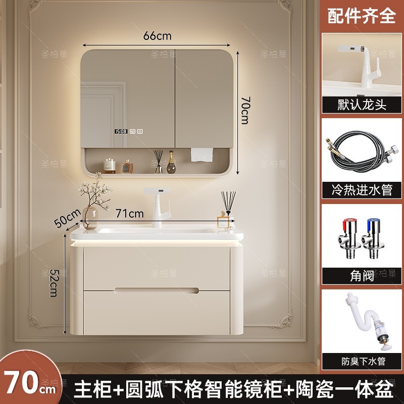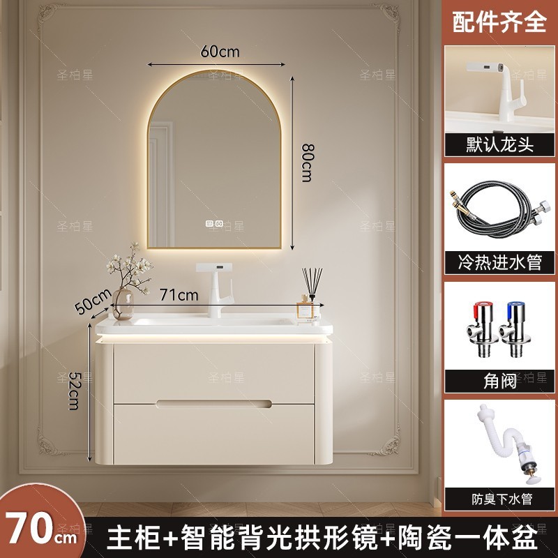 • 아크 하부 그리드 스마트 거울 캐비닛 - 70CM 오크 메인 캐비닛 [세라믹 일체형 세면대]