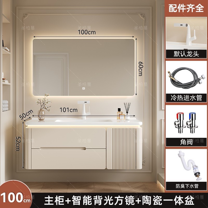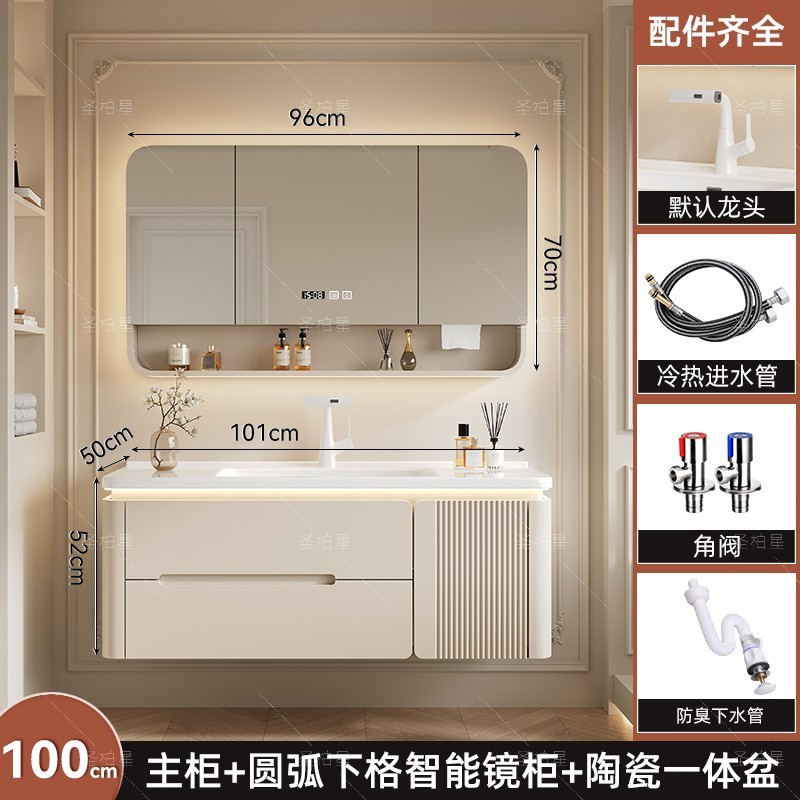 • 아크 하부 그리드 스마트 거울 캐비닛 - 100CM 오크 메인 캐비닛 [세라믹 일체형 세면대]