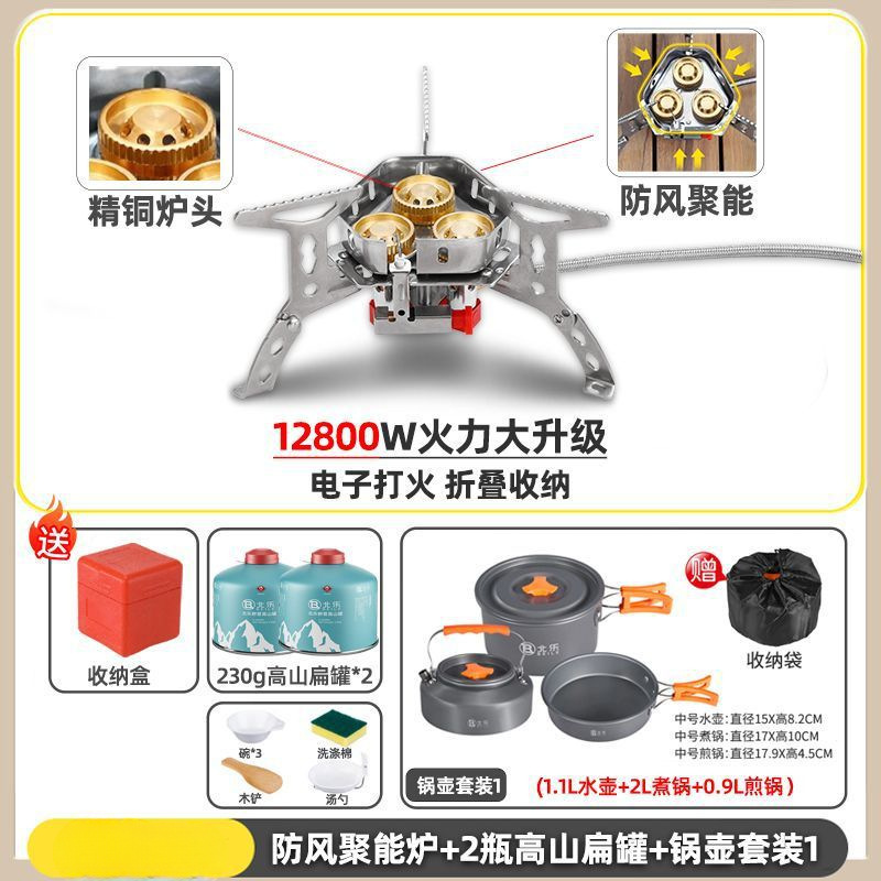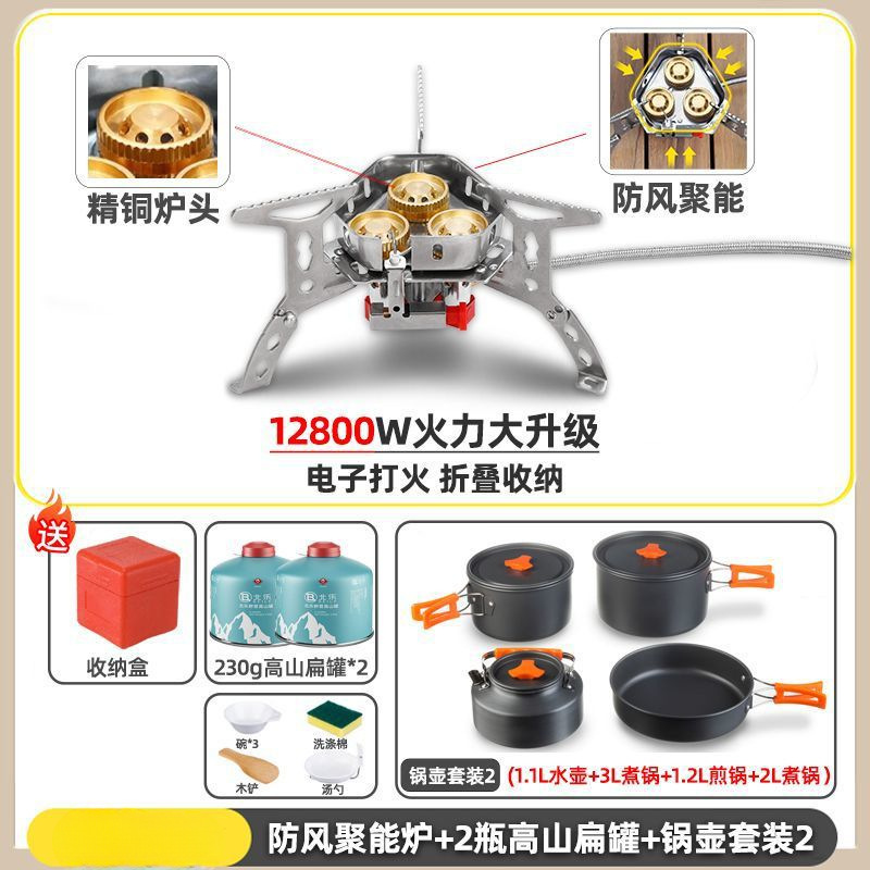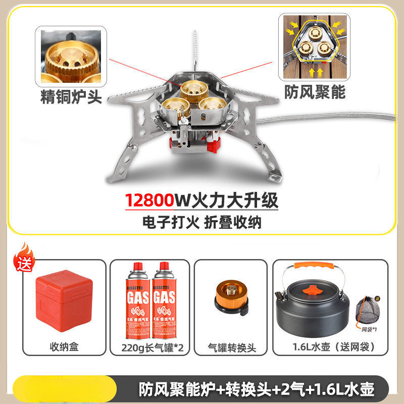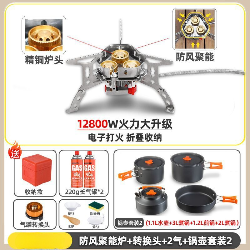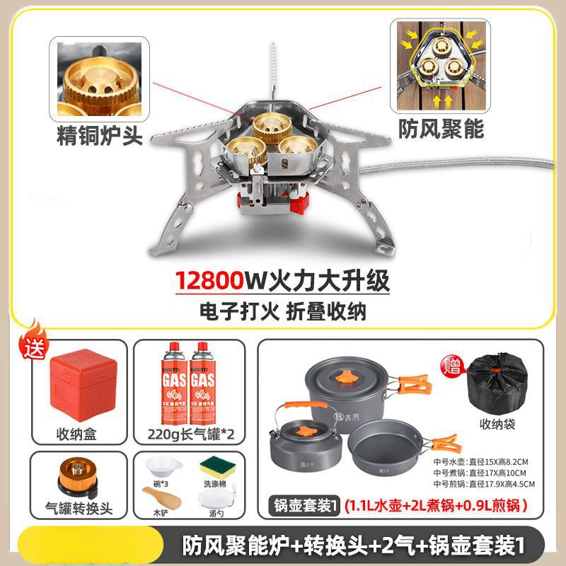• ] 12800W 동난로 [물이 끓는 데 단 1분 소요 - [방풍 에너지 수집난로] + 변환헤드 + 가스 2개 + 냄비와 주전자 세트 2
