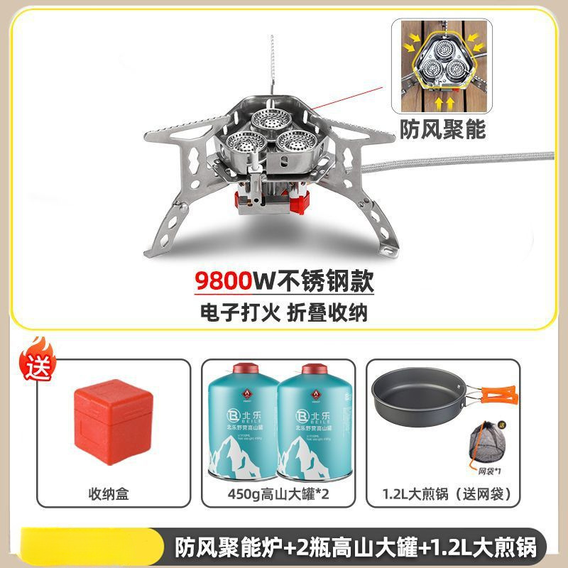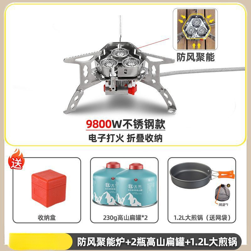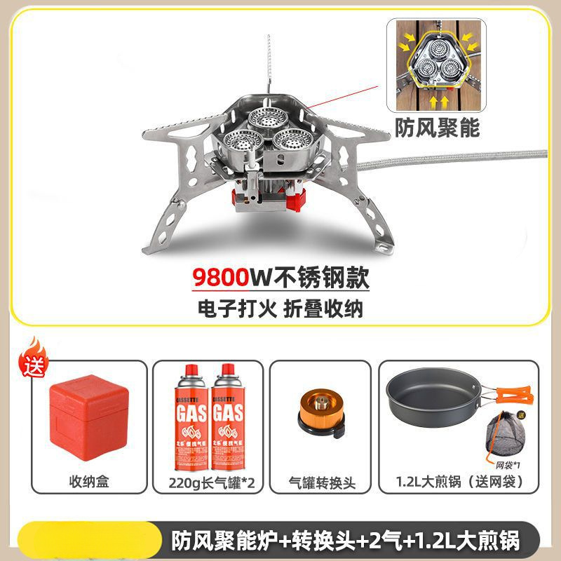 • ] 9800W 스틸버너 [물이 끓는 데 단 3분 소요 - [방풍 에너지 수집 스토브] + 변환 헤드 + 가스 2개 + 프라이팬 1.2개
