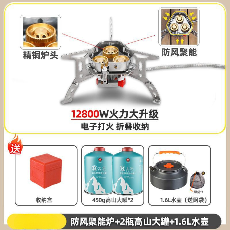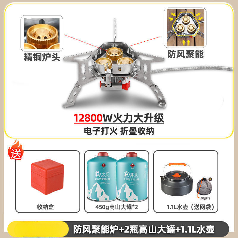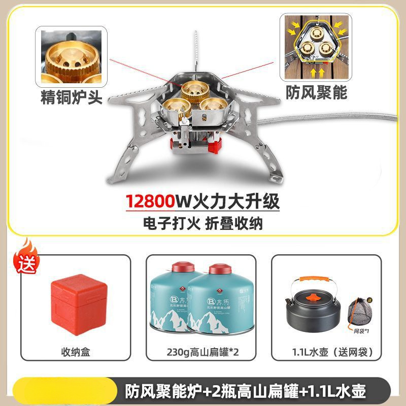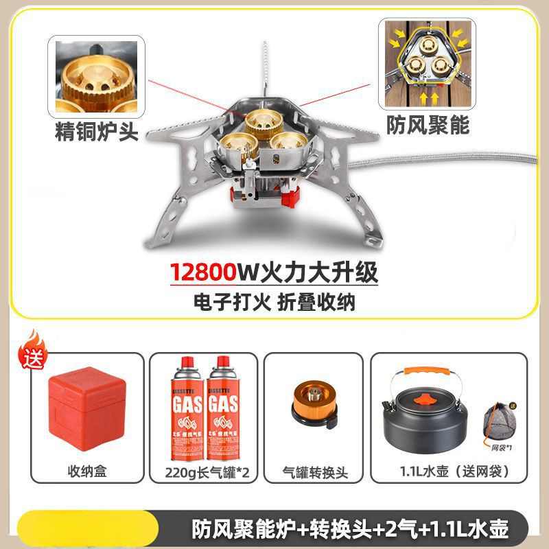 • ] 12800W 동난로 [물이 끓는 데 1분밖에 걸리지 않습니다 - [방풍 에너지 수집 난로] + 변환 헤드 + 가스 2개 + 주전자 1.1개