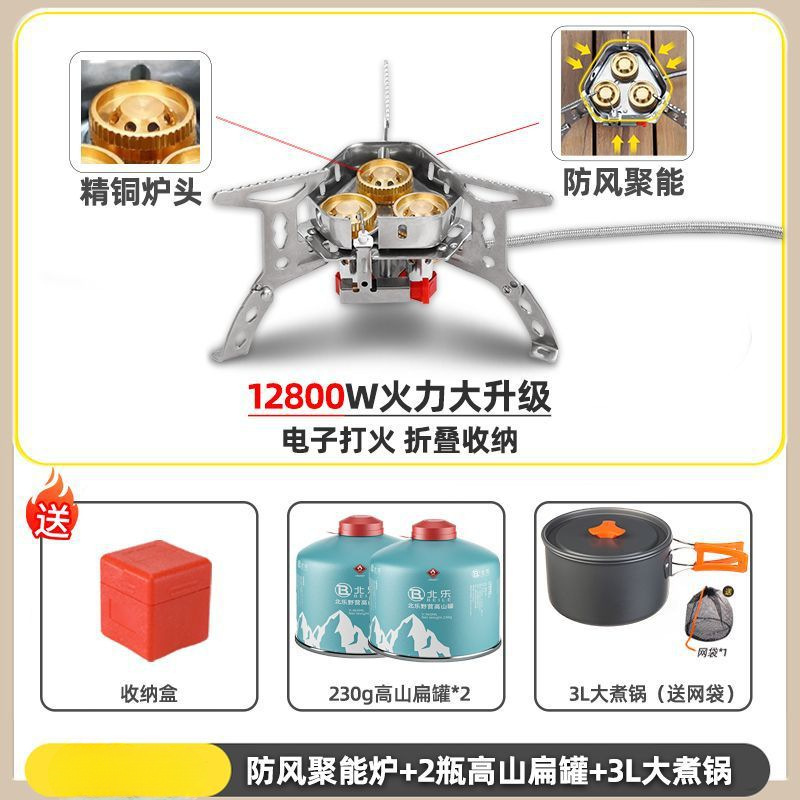 • ] 12800W 동난로 [물이 끓는 데 단 1분 소요 - [방풍 에너지 수집난로] + 변환헤드 + 가스 2개 + 3L 대형 냄비