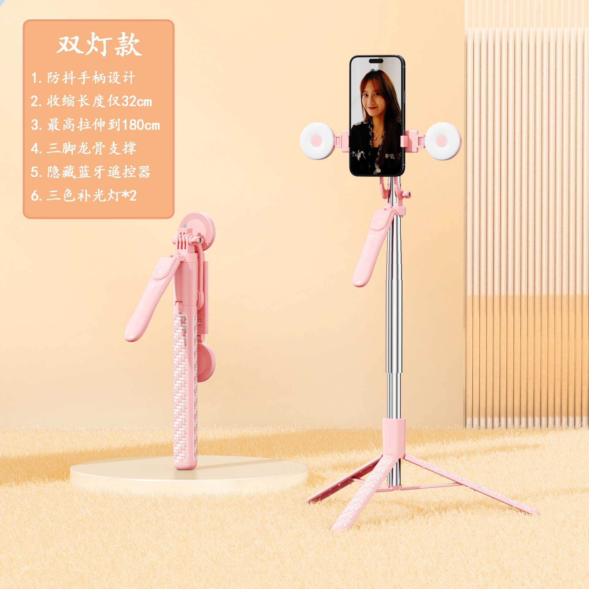 • Z18-더블 라이트-핑크 [ 1.8m + 안정적인 촬영 핸들 + 배터리 리모콘 + 대형 원형 조명 2개]