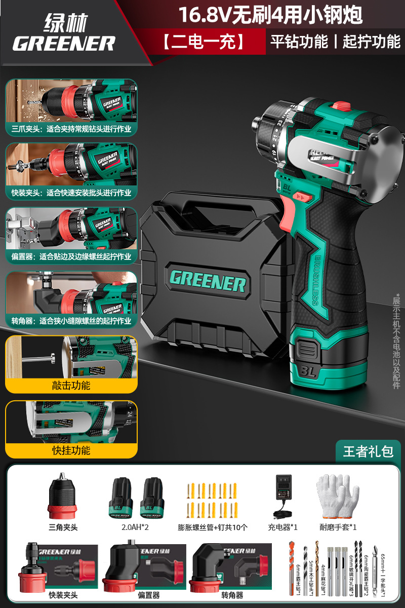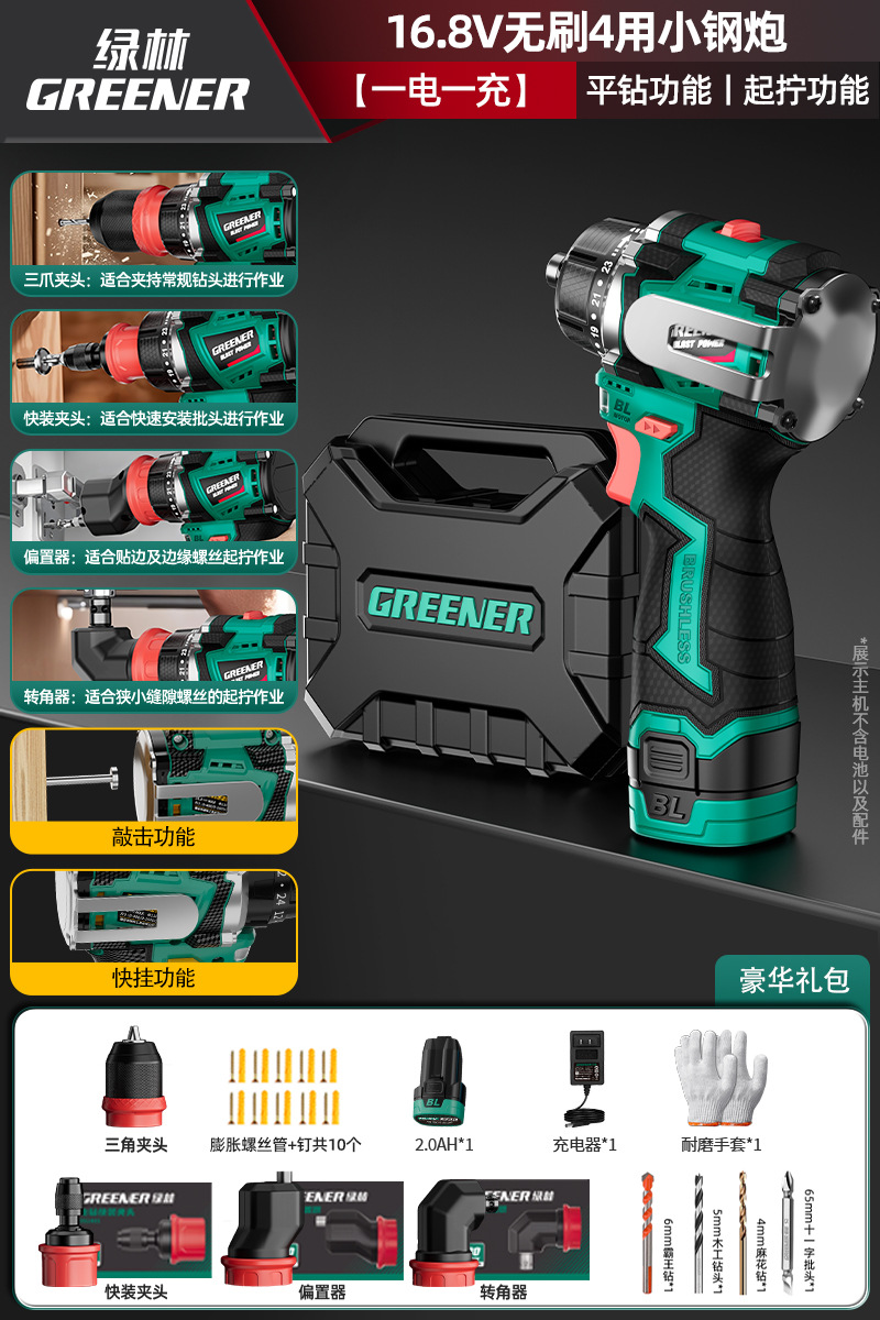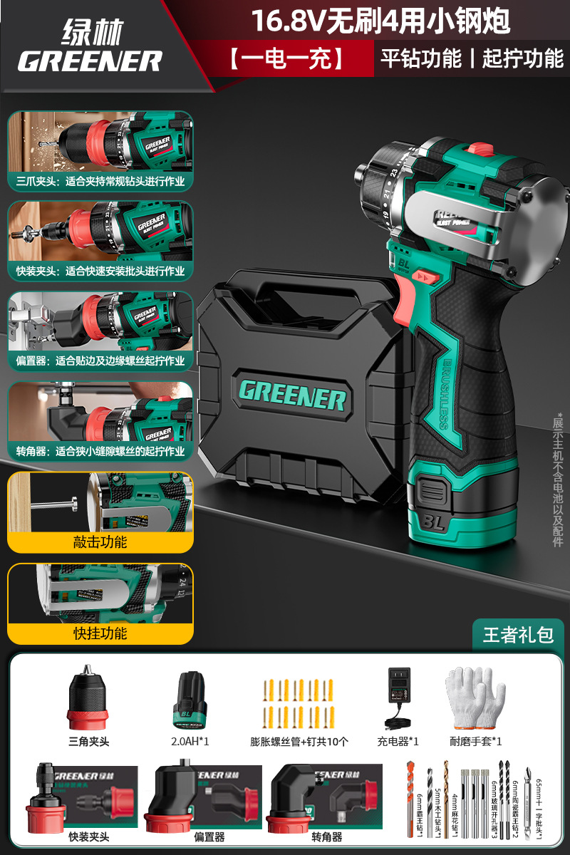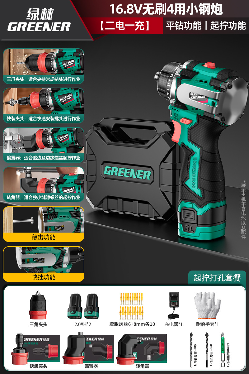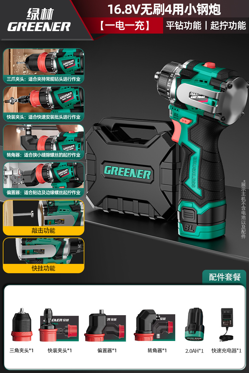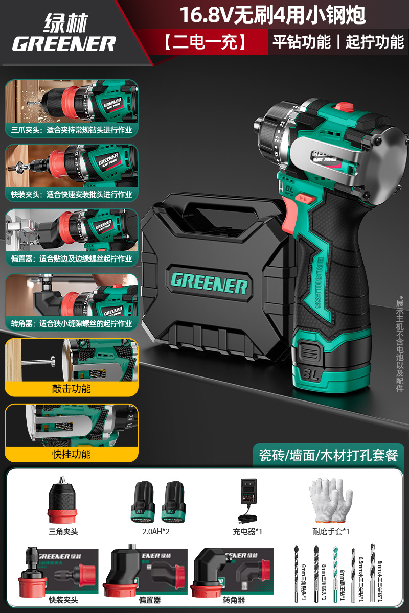 Green Forest 4-Use 소형 강철 총 4헤드 전기 드릴 가정용 브러시리스 리튬 전기 권총 드릴 다기능 벽 파기 퀵 체인지 척스토어 가기