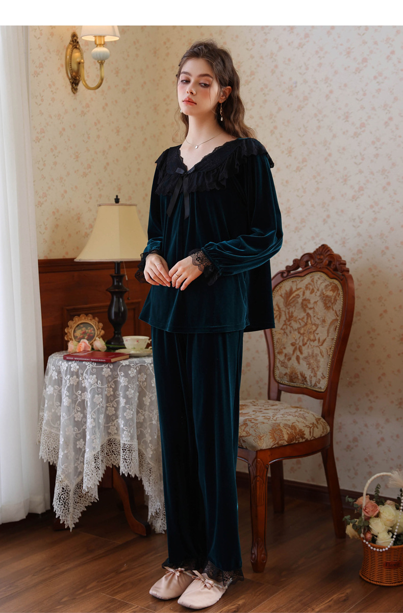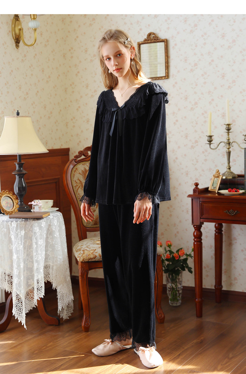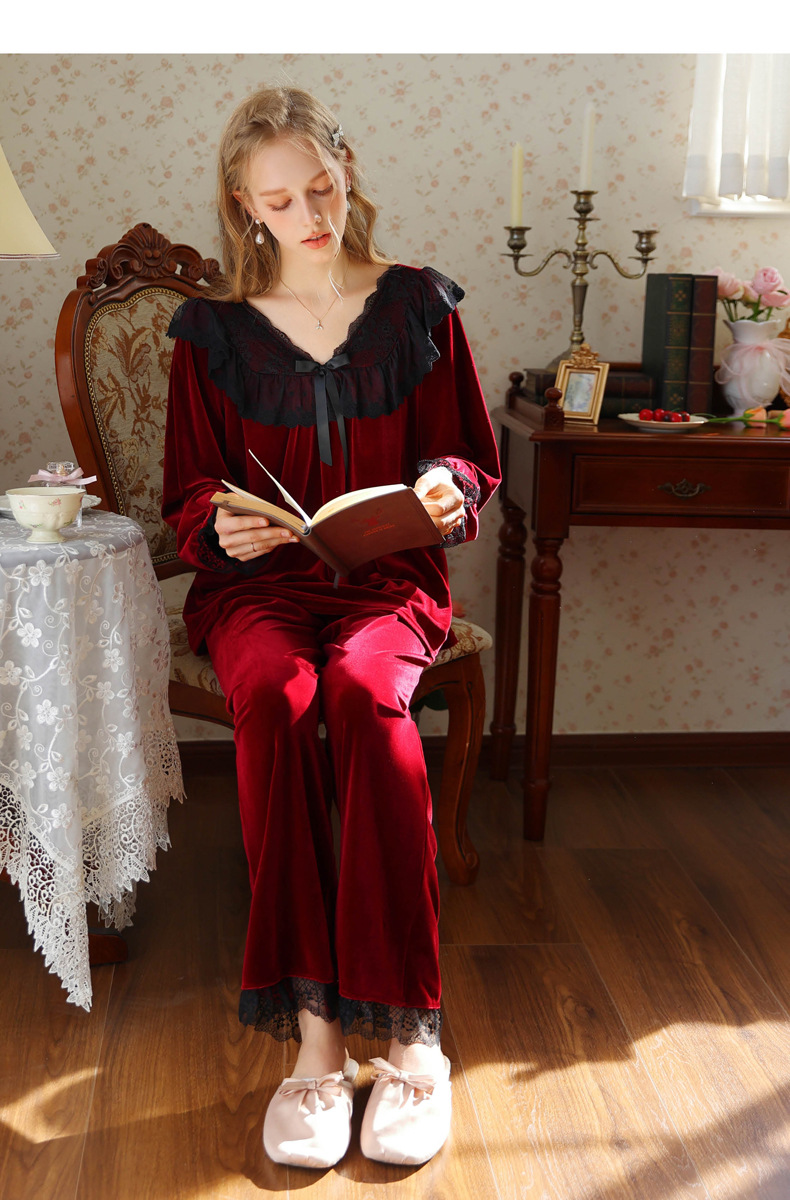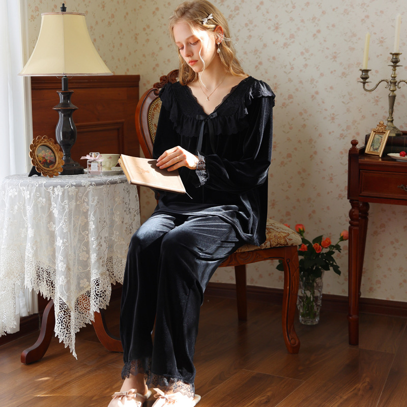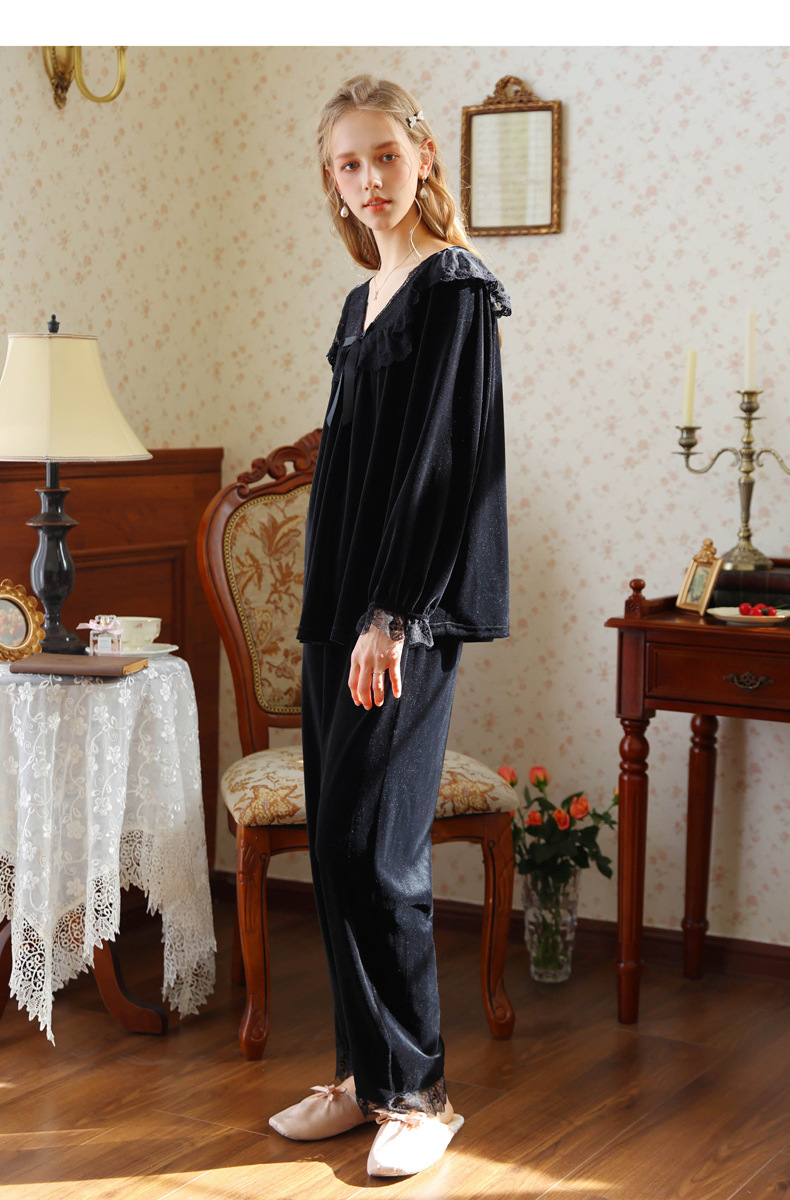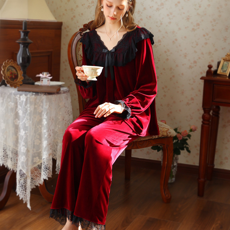 새로운 잠옷 가을, 겨울 프랑스 복고풍 공주 긴팔 바지 달콤한 따뜻한 느슨한 대형 크로스 보드 벨벳 홈 의류