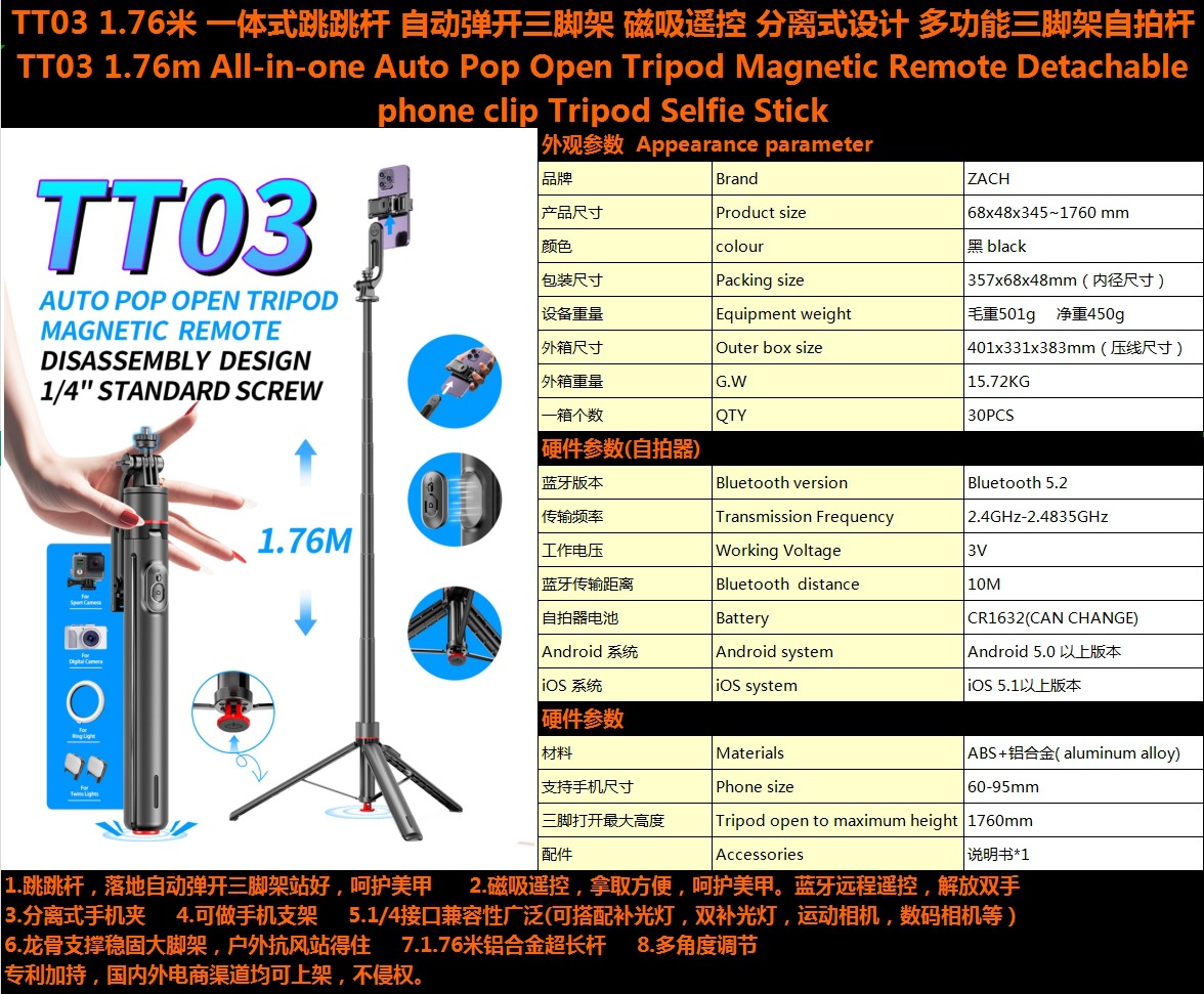 ZACH 플로어 스탠딩 셀카봉, 흔들림 방지, 접이식 라이브 방송 블루투스 삼각대, 휴대폰 사진 촬영, 자동 즉시 스탠드스토어 가기