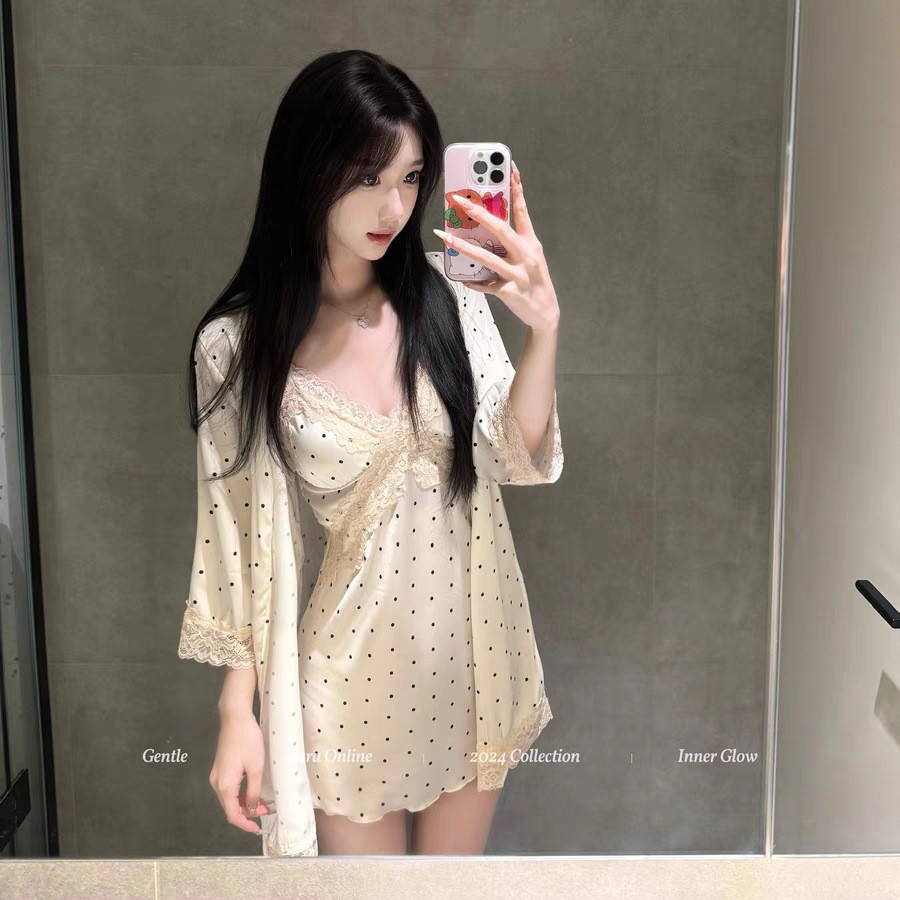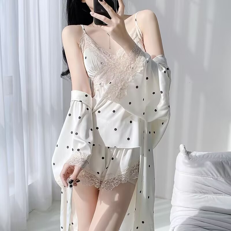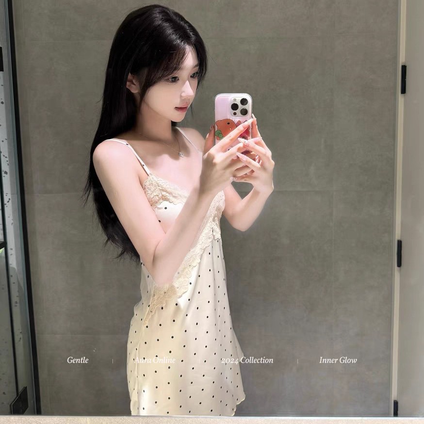 플러스 사이즈 스위트 인 스타일 여름 새 홈웨어 잠옷 목도리 투피스 세트 레이스 폴카 도트 서스펜더 스커트스토어 가기