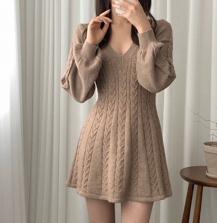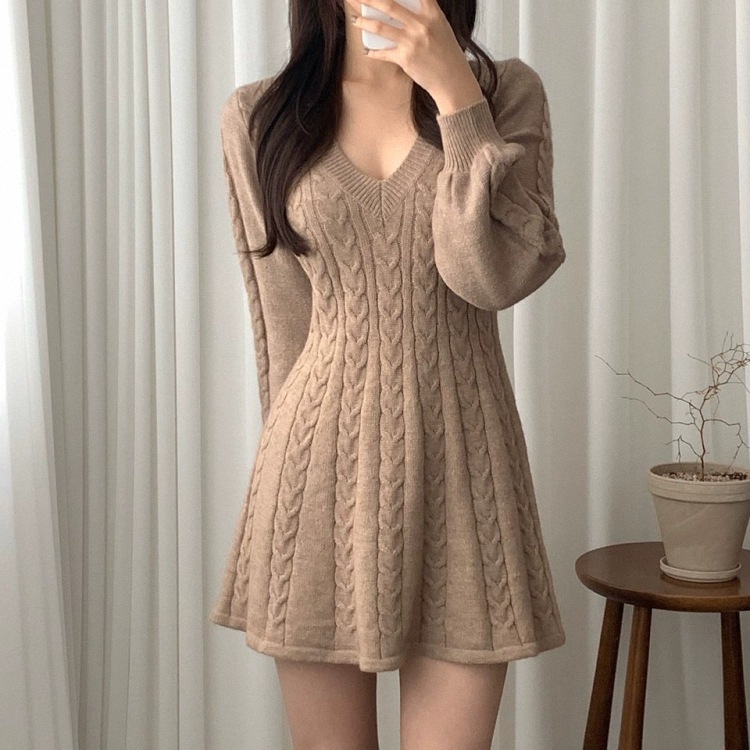 한국어 버전 2025 새로운 가을 겨울 랜턴 긴팔 V 넥 트위스트 연령 감소 바닥 니트 여성용 다용도 허리 드레스스토어 가기