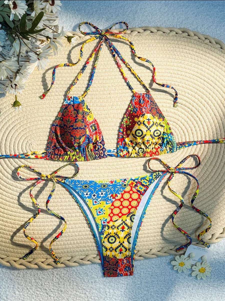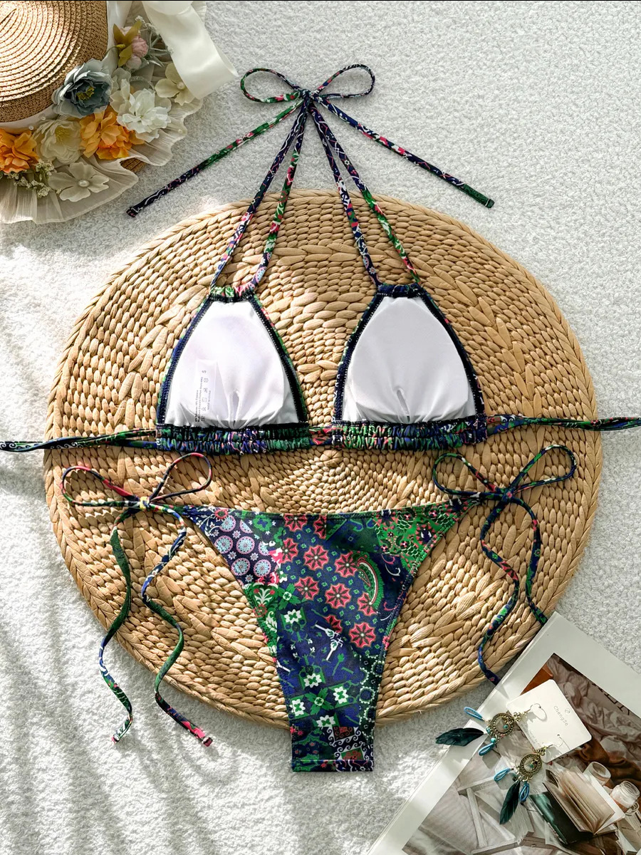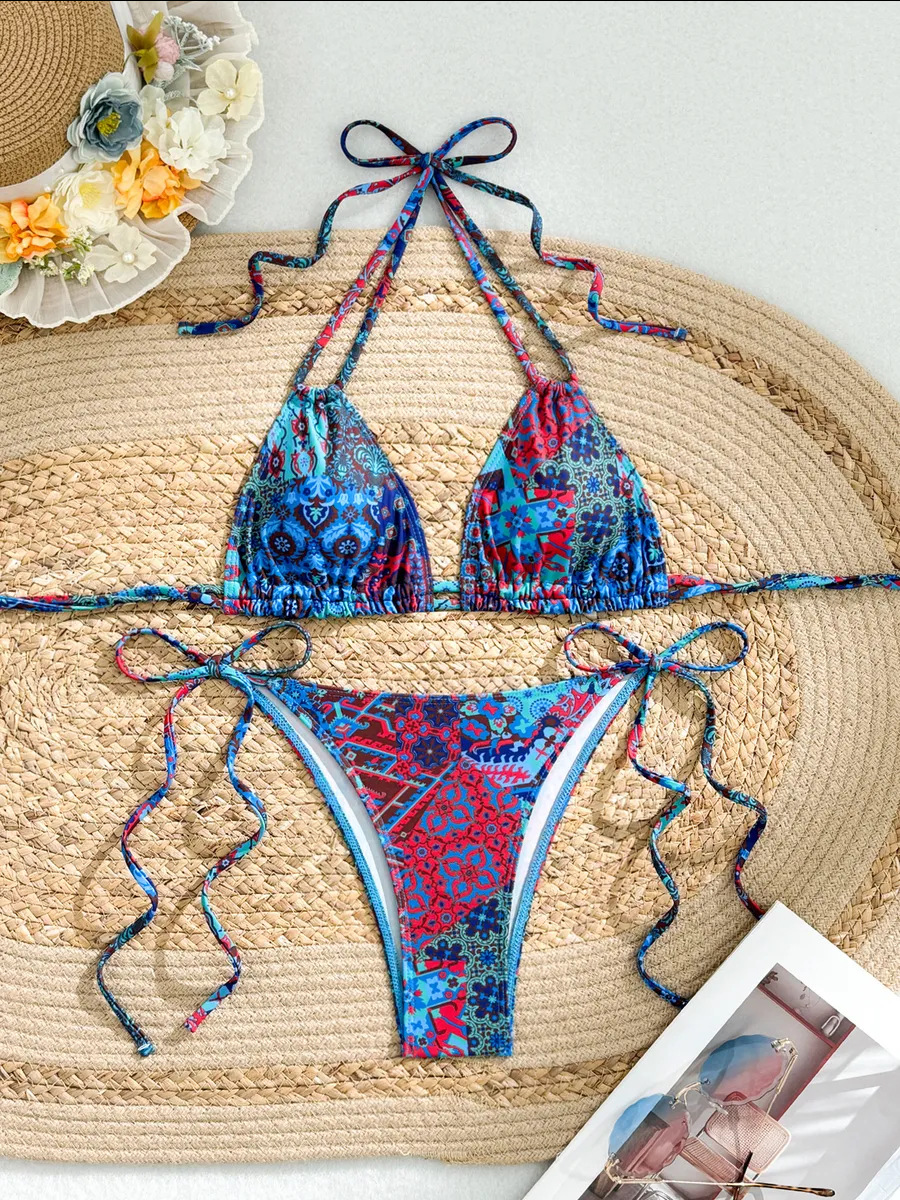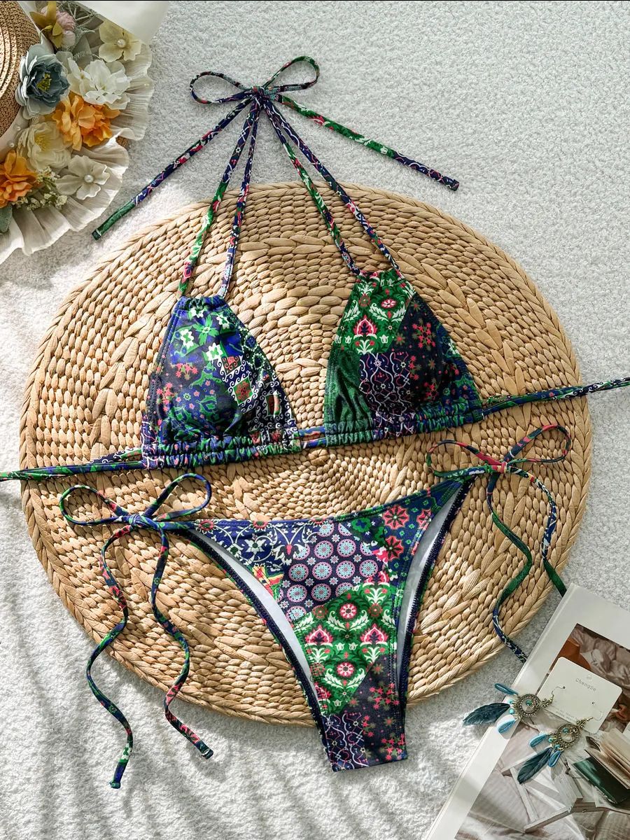 2025 새로운 유럽과 미국의 민족 스타일 스플릿 수영복 섹시한 더블 레이스 업 비키니 수영복 비키니 크로스 보더 수영복스토어 가기