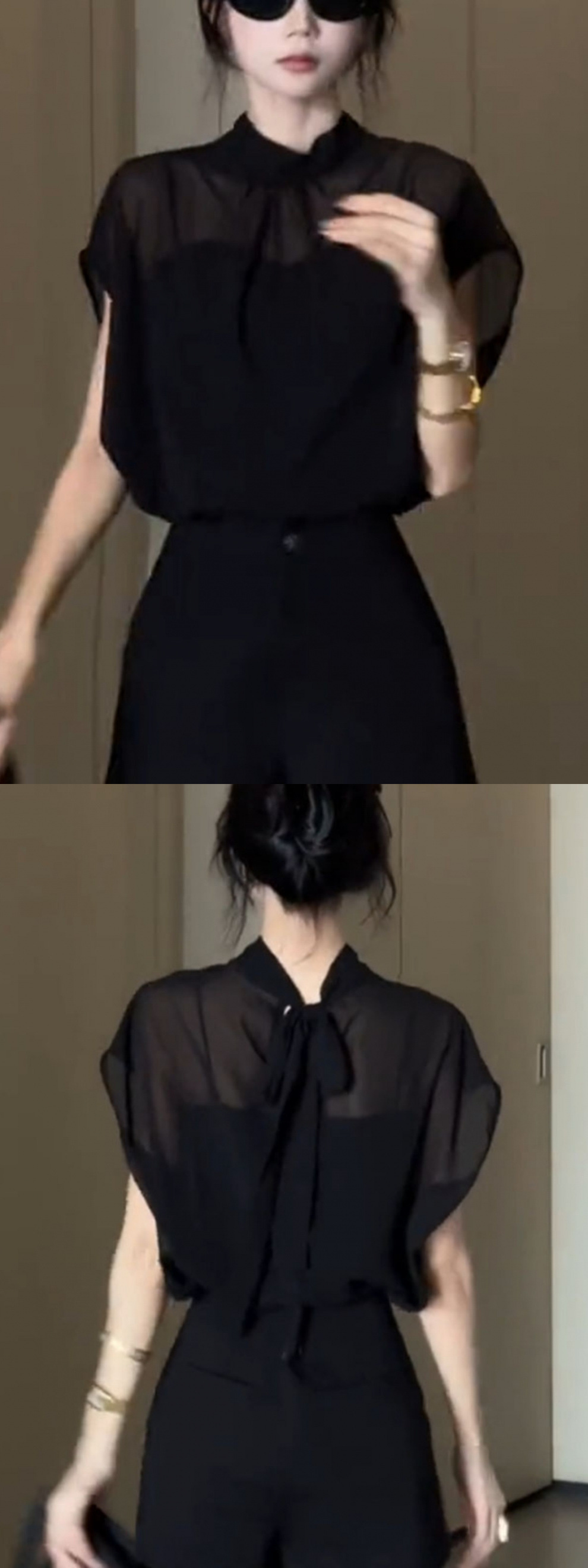 여성을위한 블랙 Tulle Bow Tie 스탠드 칼라 반팔 쉬폰 셔츠 2025 여름 새로운 패션 스타일 탑스토어 가기