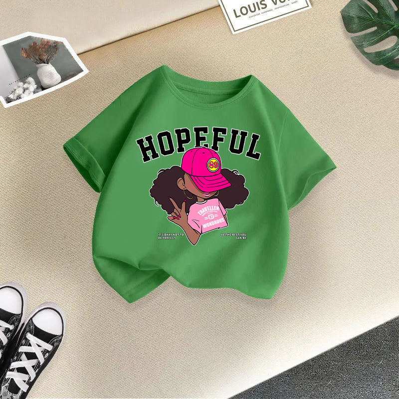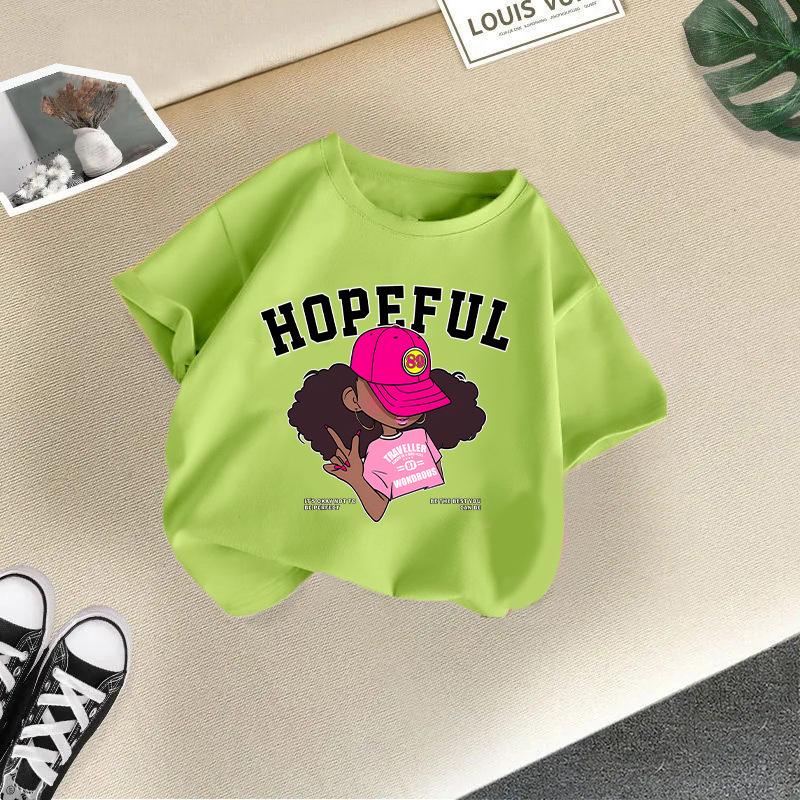 • 잔디 녹색 분홍색 편지 분홍색 모자 소녀 반팔
