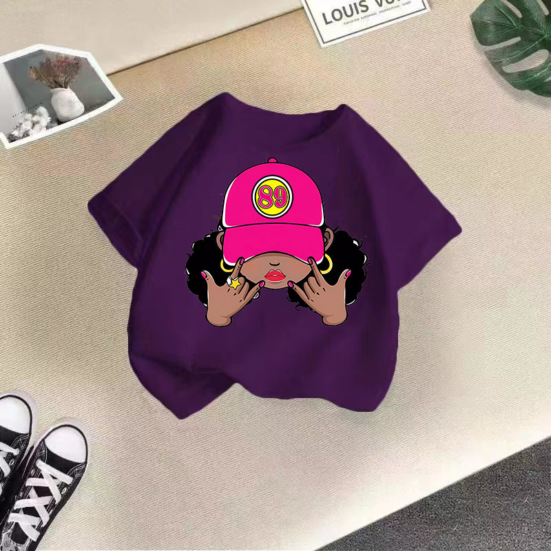• 보라색 검정색 문자 핑크 모자 소녀 반팔