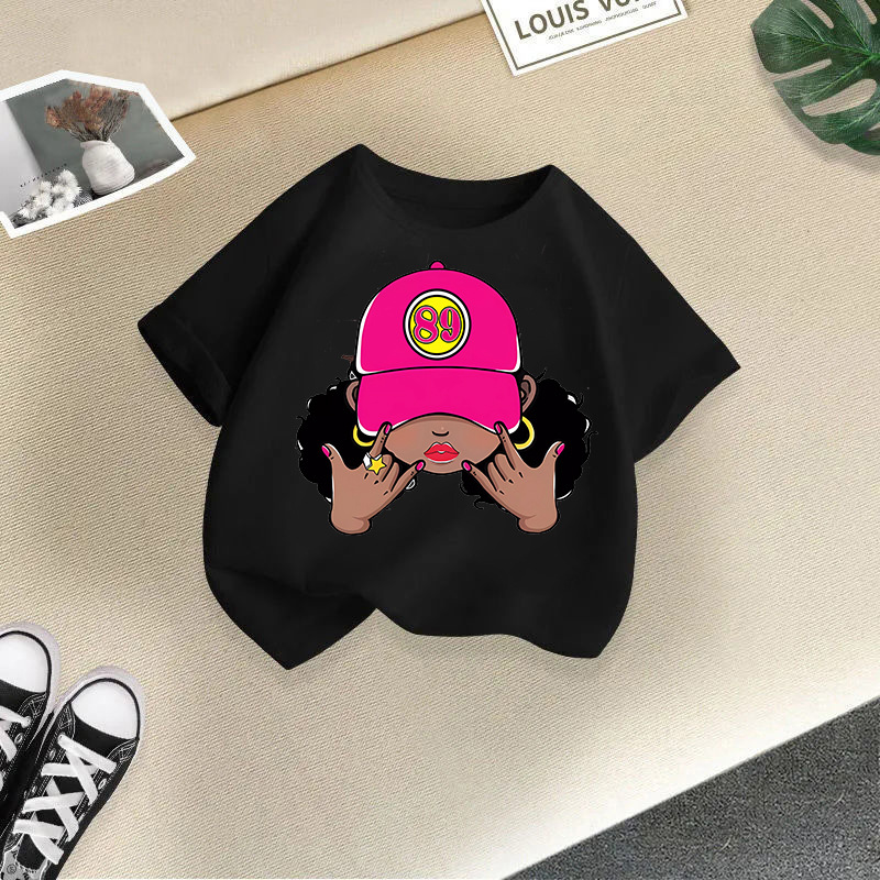 • 블랙 핑크 편지 핑크 모자 소녀 반팔