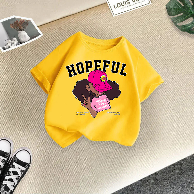 • 노란색 검정색 문자 핑크 모자 소녀 반팔