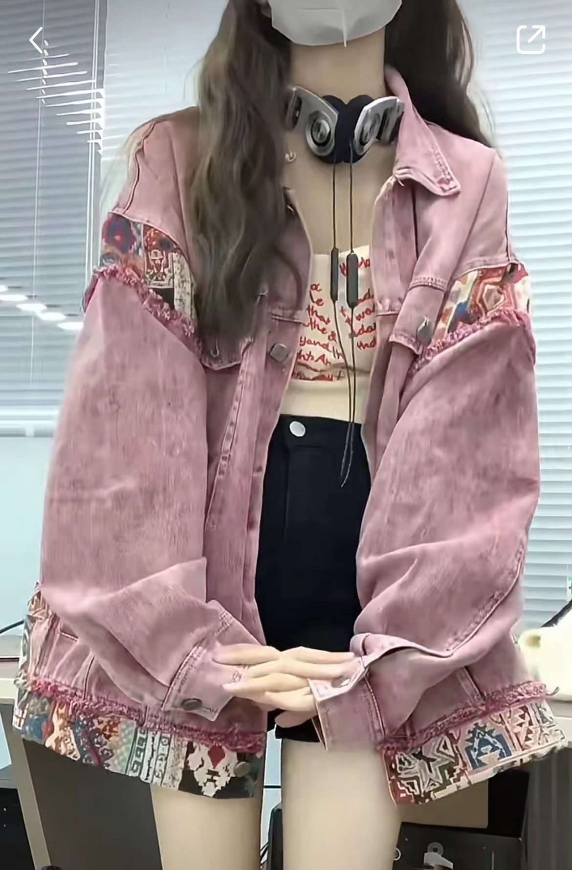 여성을 위한 아메리칸 레트로 스플라이싱 아트 데님 재킷, 봄, 가을 에스닉 스타일 디자인 틈새 핑크 재킷 탑스토어 가기