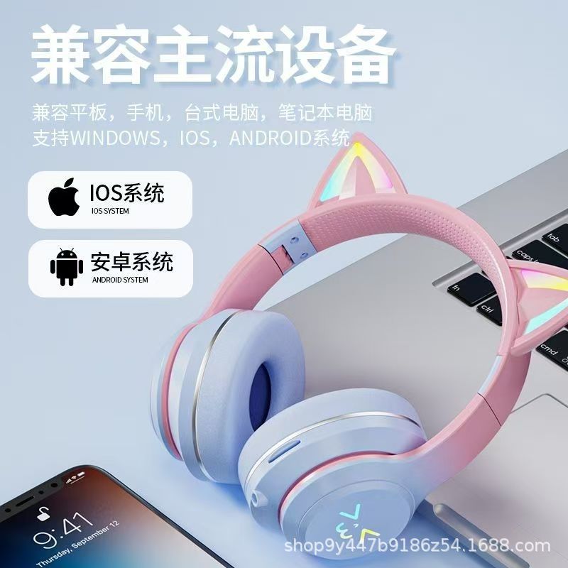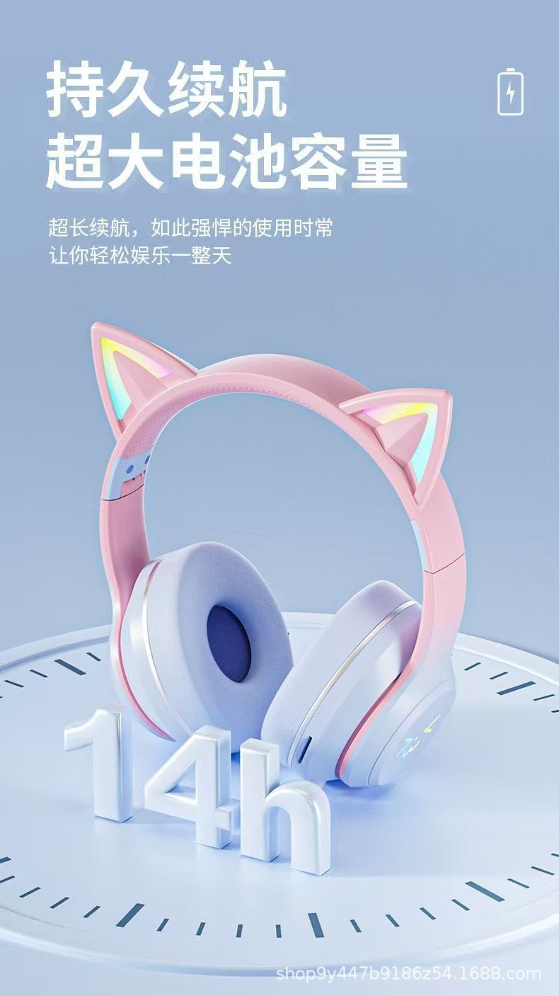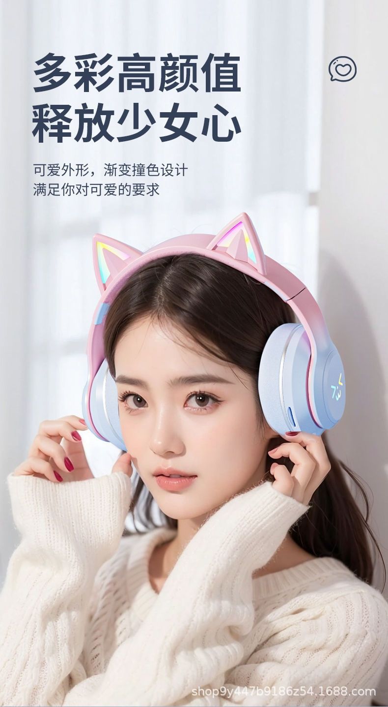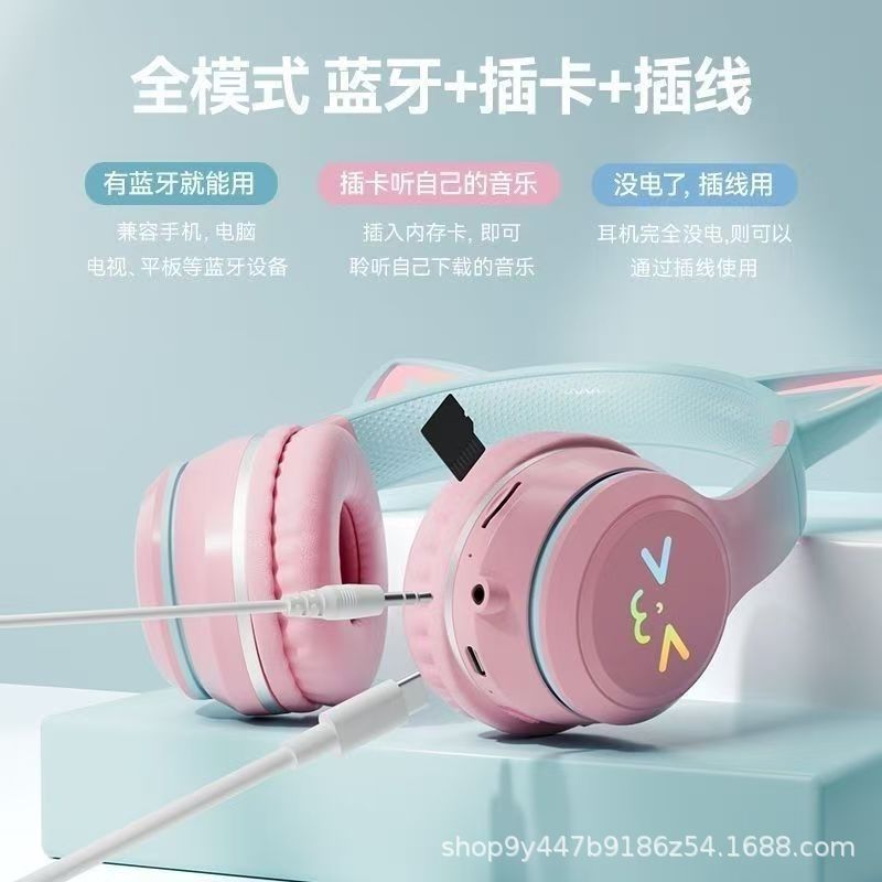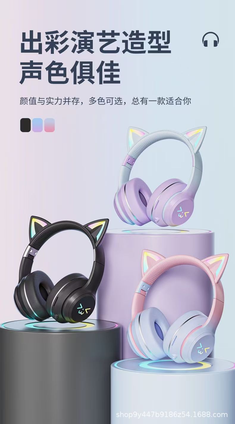 국경 간 인기 618 스팟 고양이 귀 그라데이션 빛나는 헤드 장착형 무선 블루투스 헤드셋 접이식 스포츠 헤드셋스토어 가기