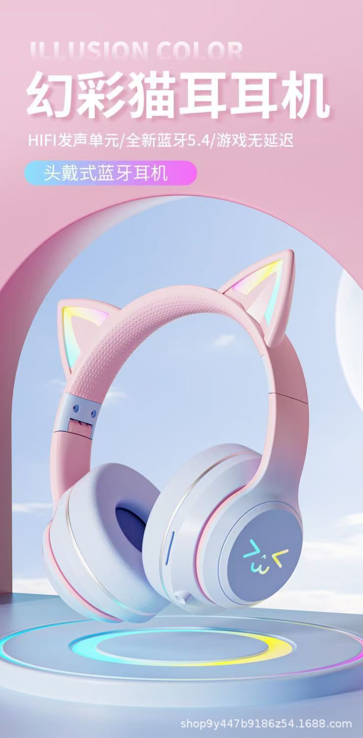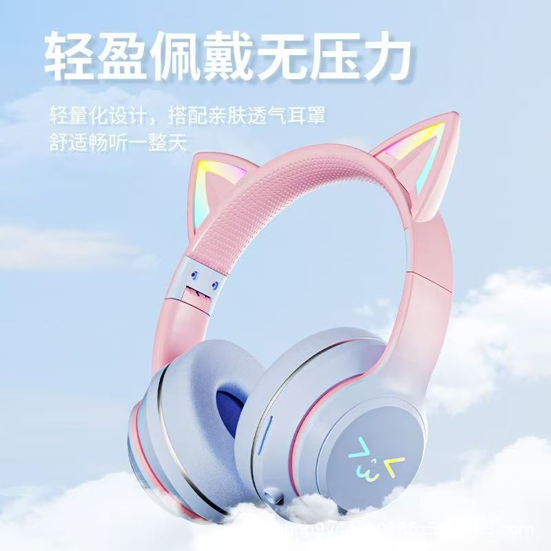 국경 간 인기 618 스팟 고양이 귀 그라데이션 빛나는 헤드 장착형 무선 블루투스 헤드셋 접이식 스포츠 헤드셋