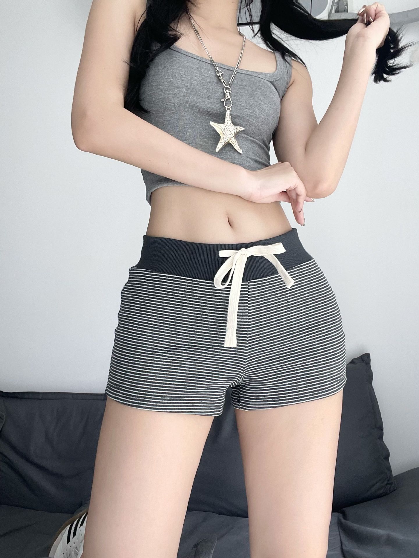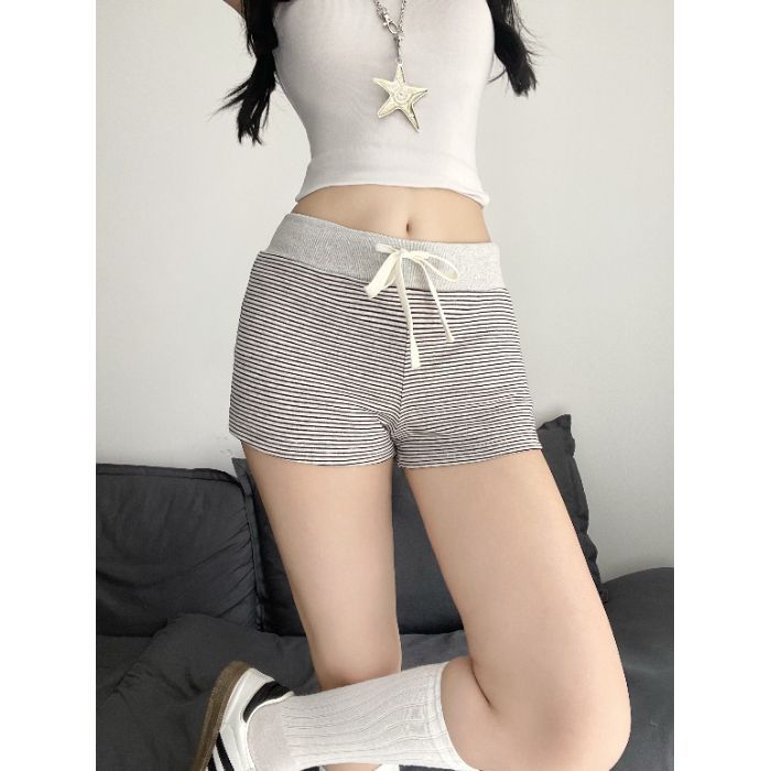 여성을 위한 디자인된 드로스트링 하이웨이스트 스트라이프 반바지 2025년 여름 새로운 스타일의 집과 야외에서 착용할 수 있는 타이트한 힙 커버 스포츠 핫팬츠스토어 가기