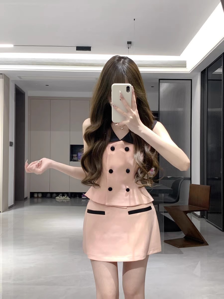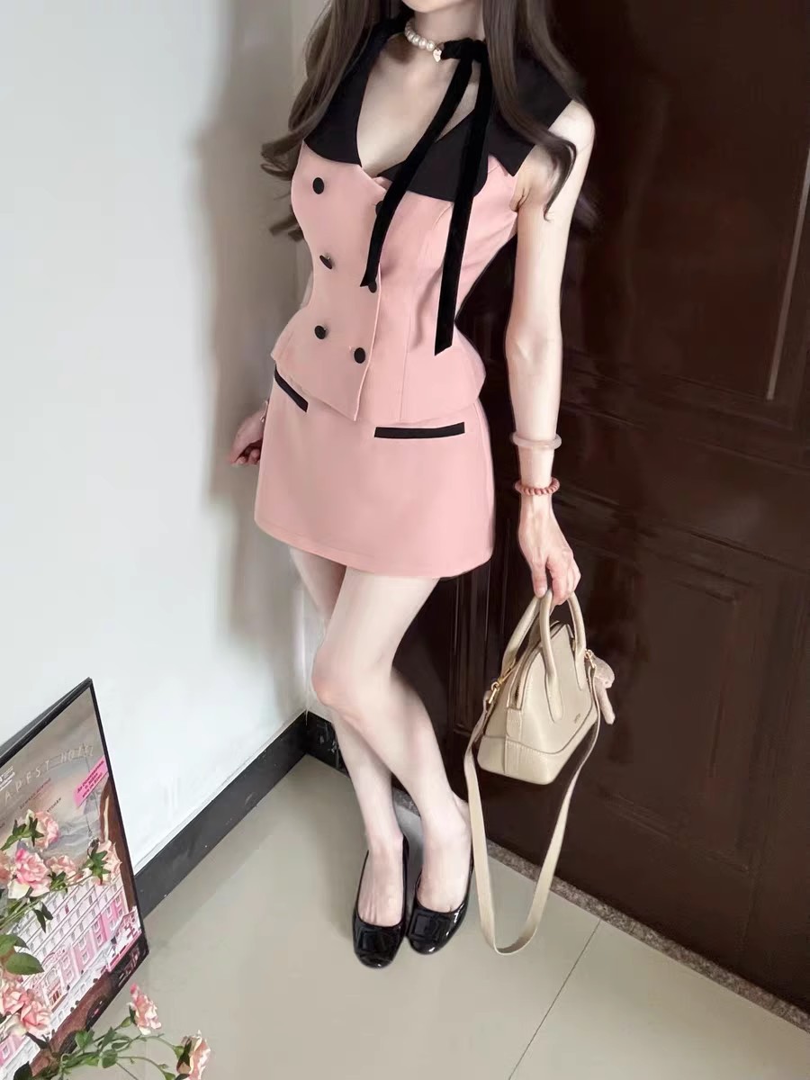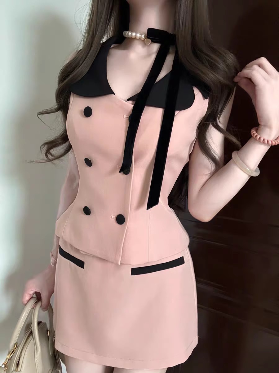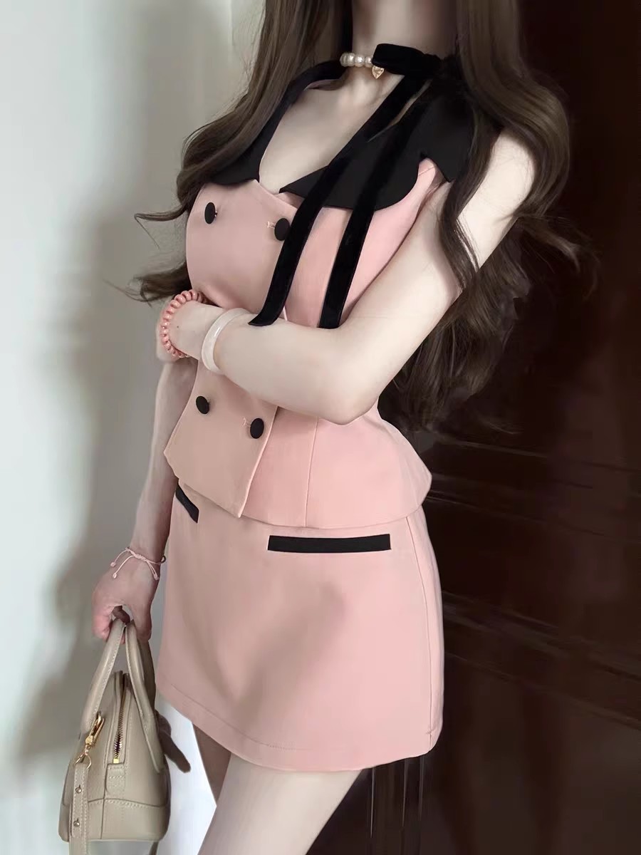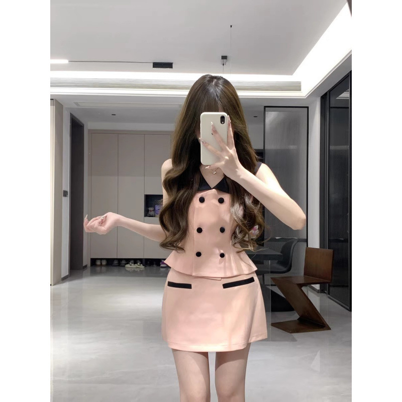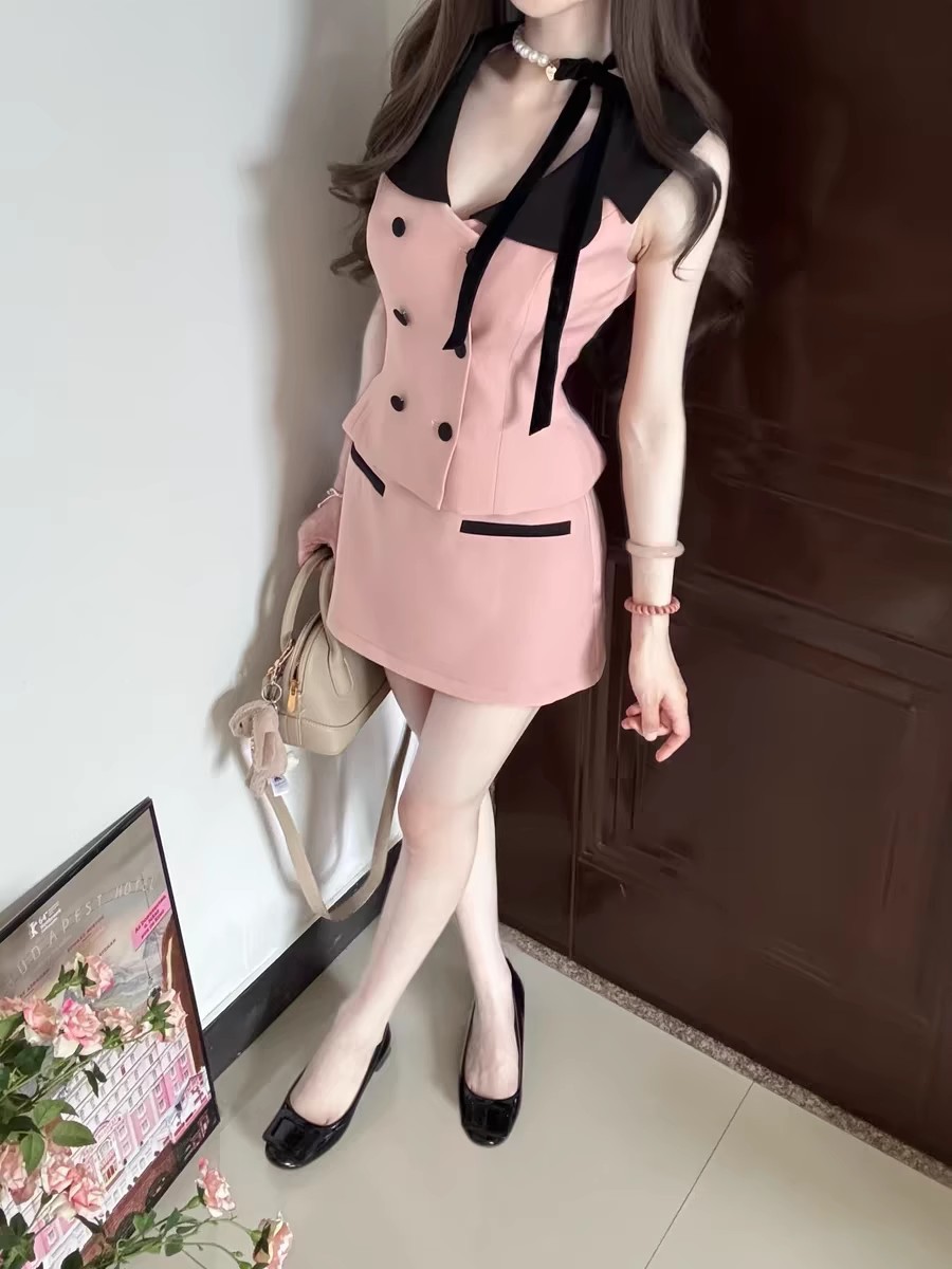여성을 위한 프랑스 패션 정장, 여성을 위한 작은 향기로운 스타일의 대비 색 칼라 조끼, 2025년 여름 새로운 스타일, 순수한 욕망 힙 스커트스토어 가기
