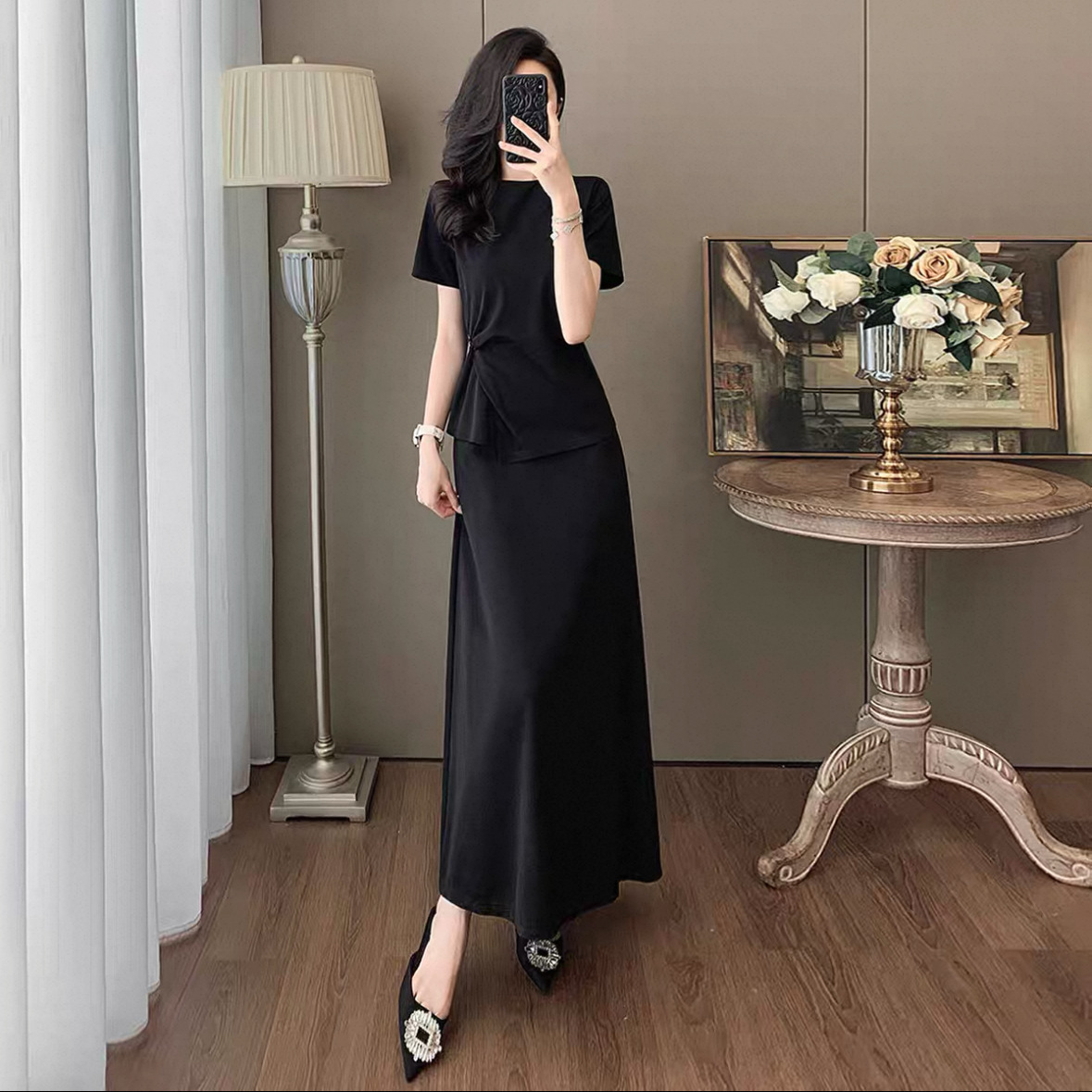 여성을위한 하이 엔드 블랙 패션 정장 스커트 여름 새로운 슬림 피트 라운드 넥 트위스트 반소매 스커트 투피스 세트