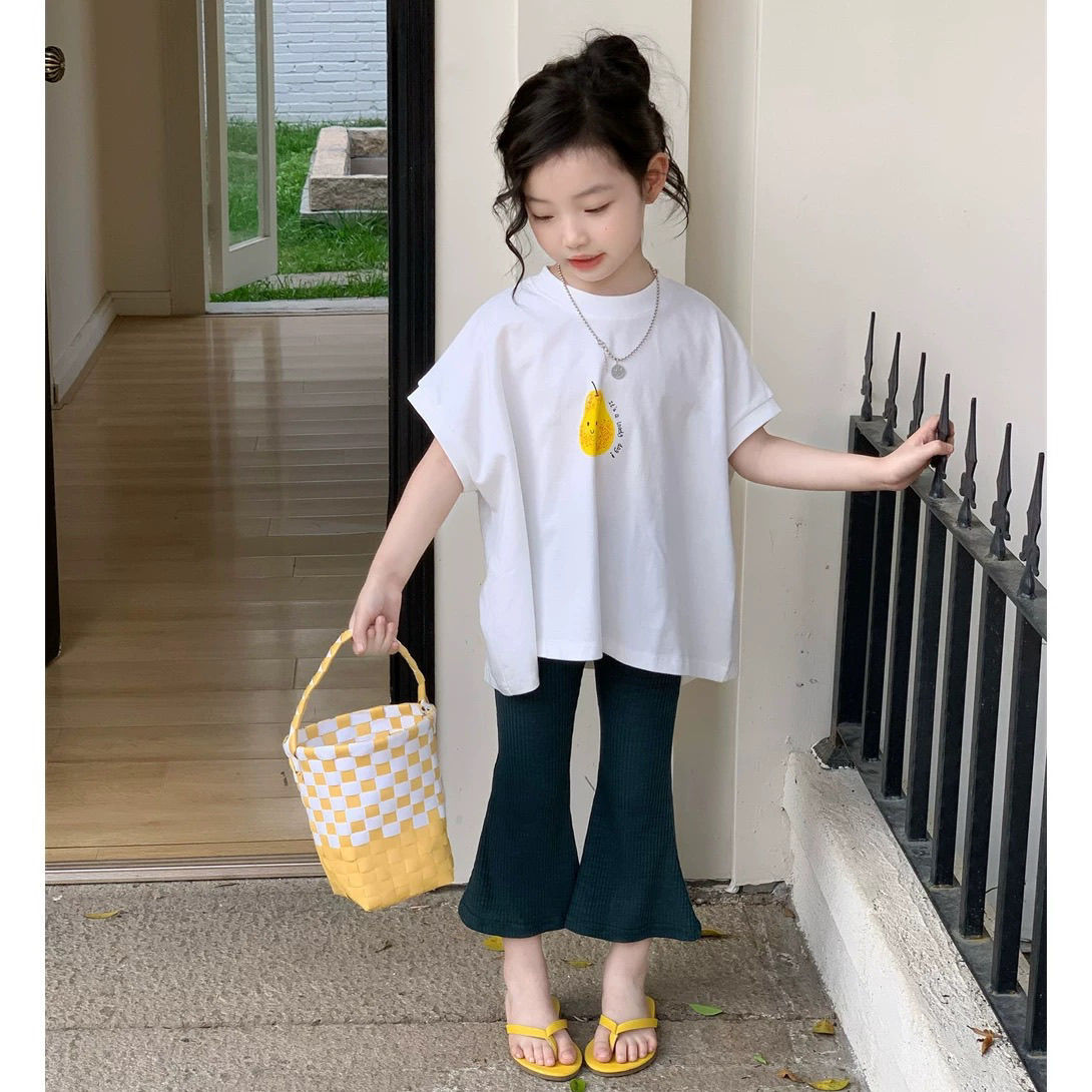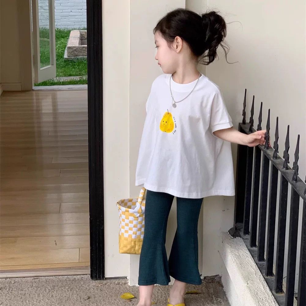 여자 만화 여름 2025 새로운 스타일 어린이 여름 옷 아기 소녀 인쇄 티셔츠 플레어 바지 투피스 세트