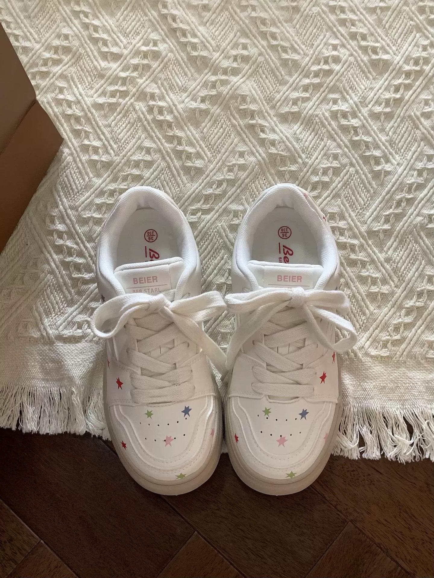 2025 봄 여성용 별이 가득한 두꺼운 밑창 컬러풀한 별 프린트 화이트 슈즈, 학생용 다용도 캐주얼 슈즈, 스포츠 스니커즈