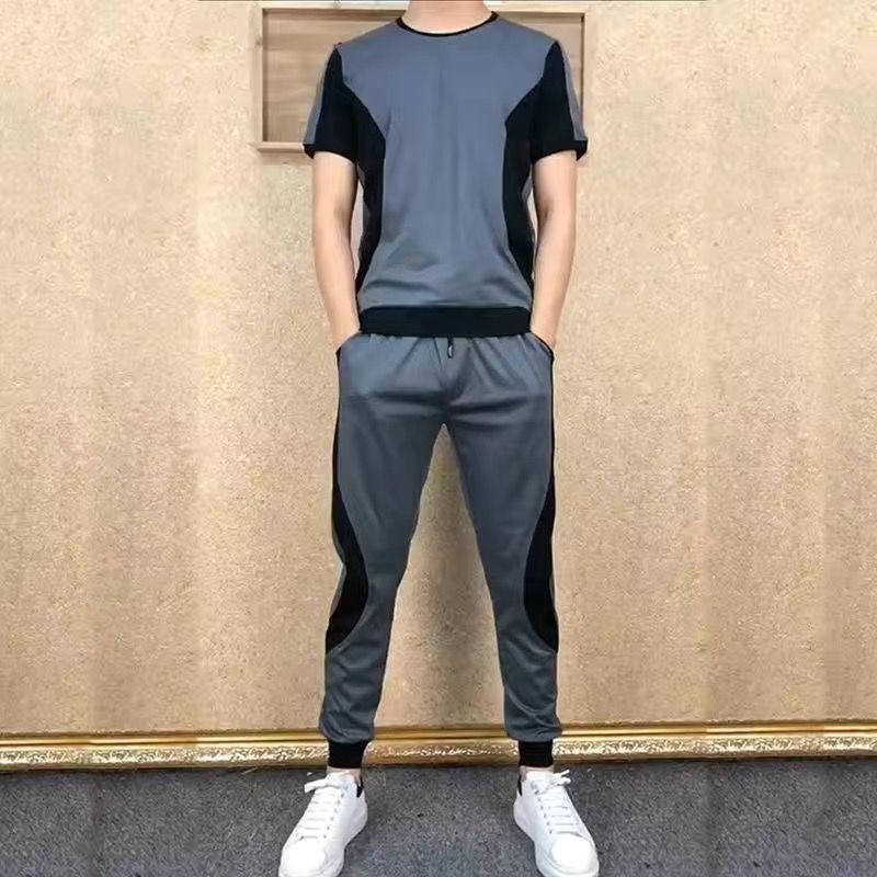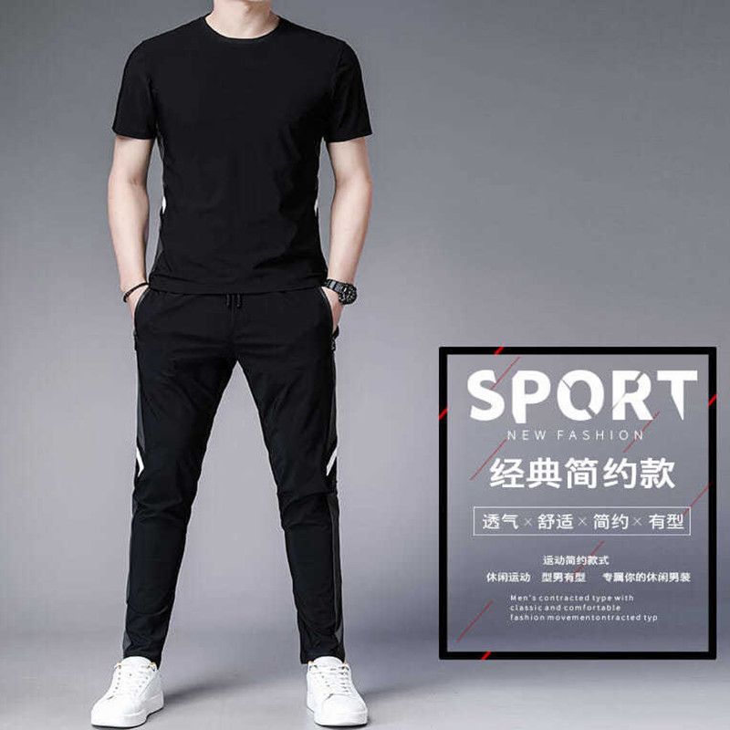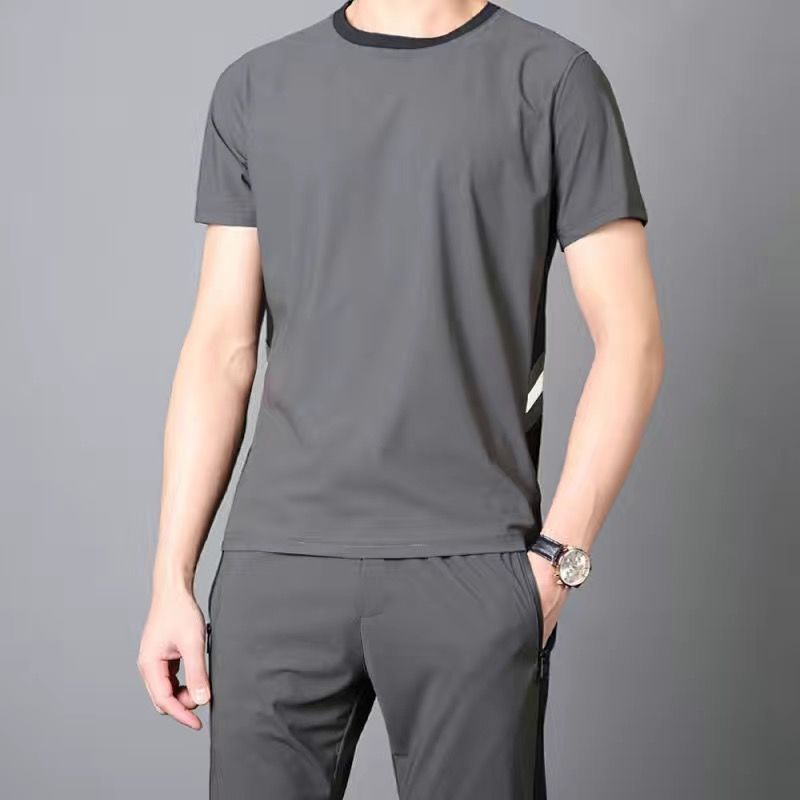 여름 옷 남성용 아이스 실크 클래식 스포츠 정장 남성용 세련된 다용도 스플 라이스 반팔 바지 정장 로가 스팟
