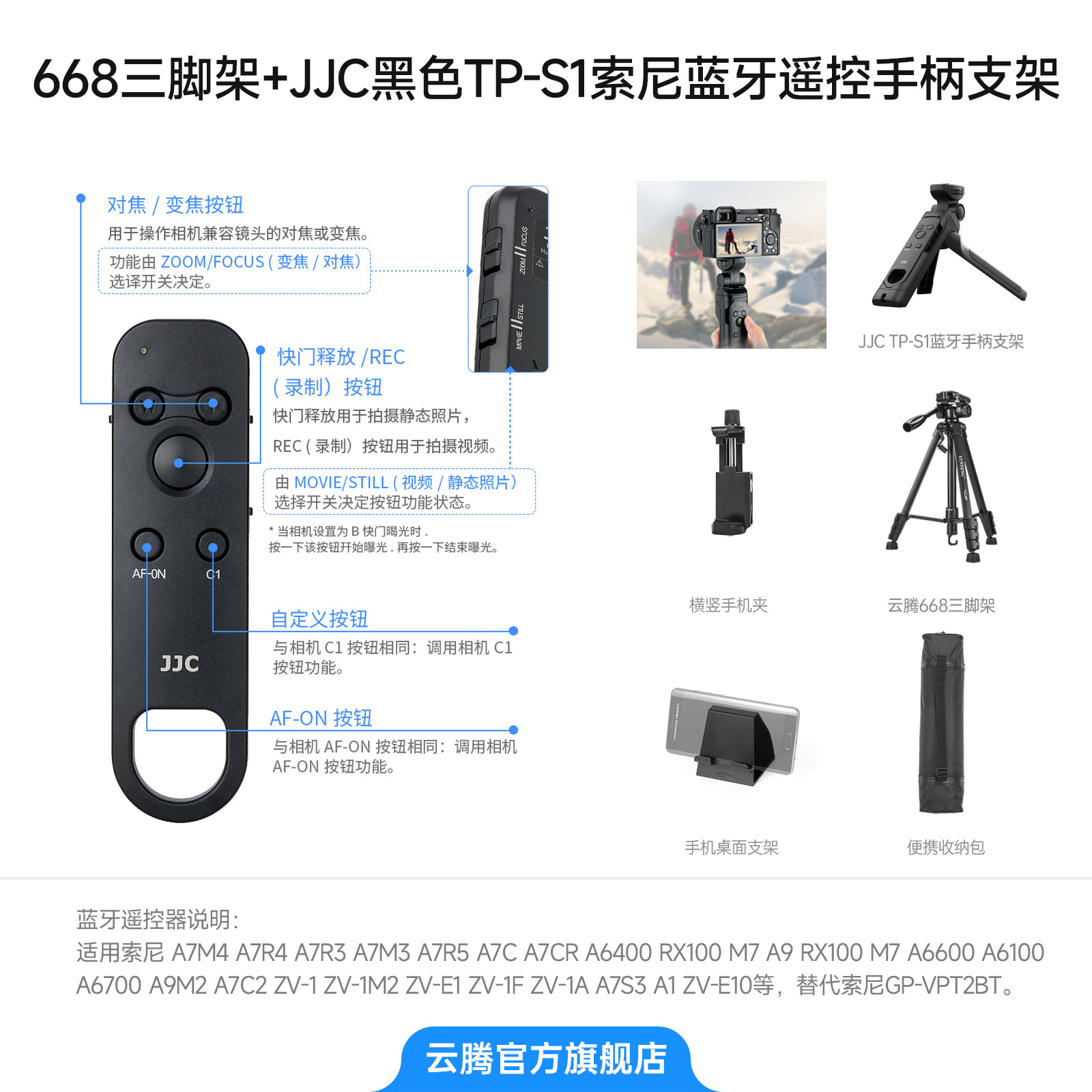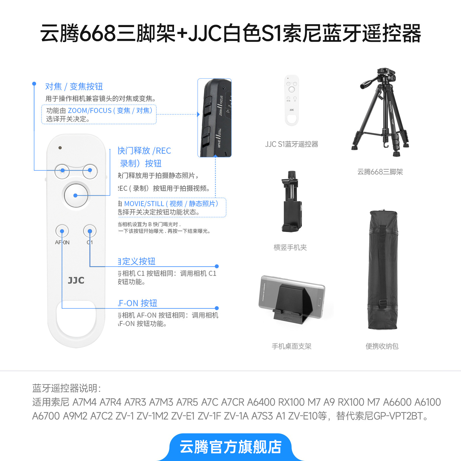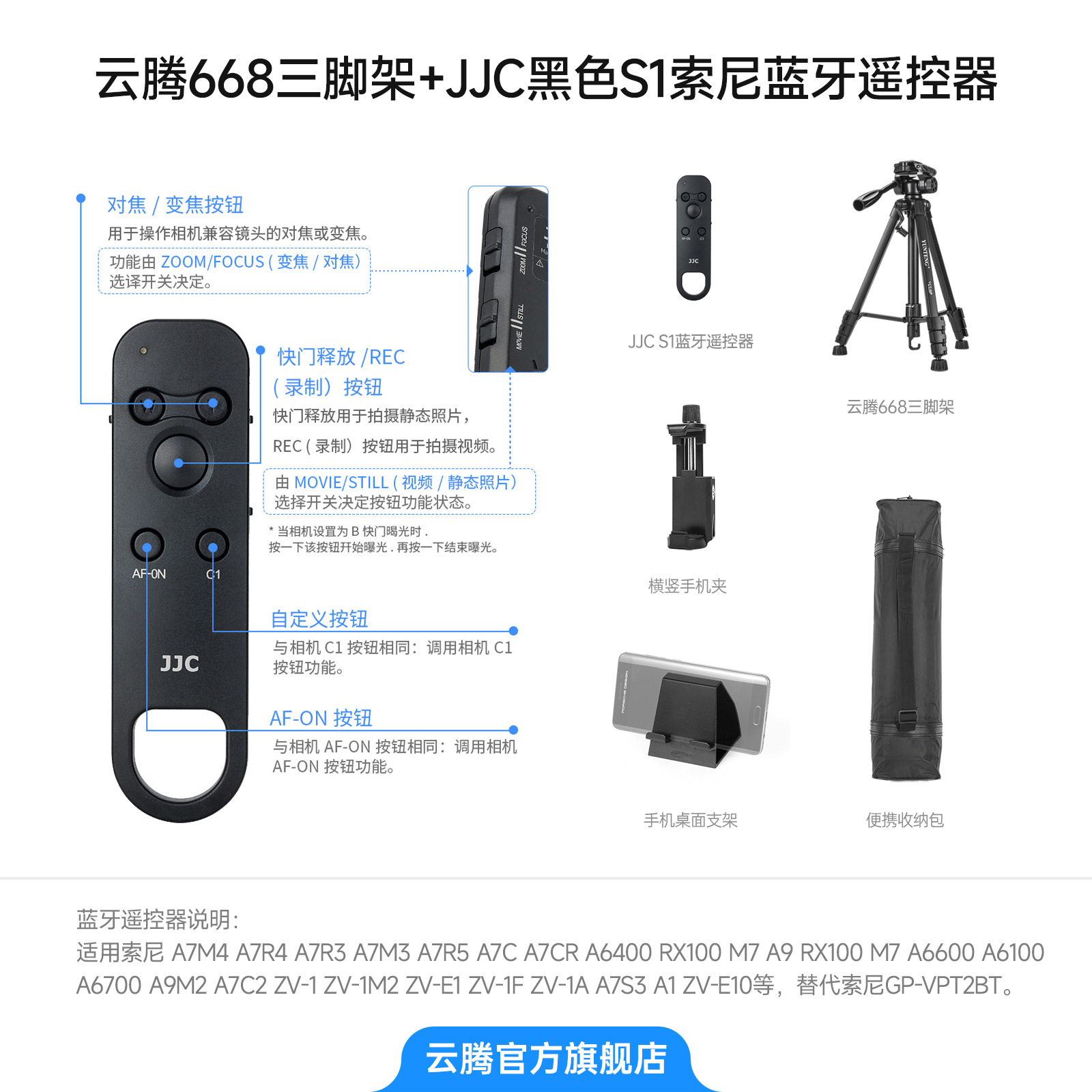 • [ 2.208m 삼각대 ] + JJC 블랙 S1 소니 블루투스 리모컨 + 수납가방 + 가로 및 세로 휴대폰 클립 + 휴대폰 데스크탑 스탠드