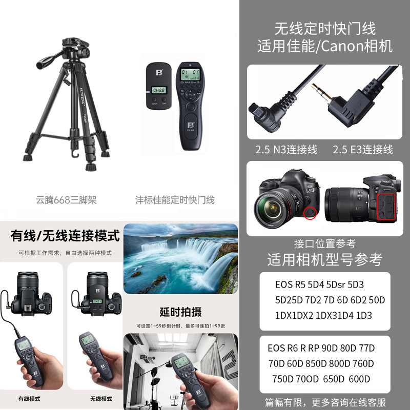 • [삼각대 2.208m 개] + Fengbiao Canon 무선 타이밍 셔터 케이블 + 보관 가방 + 수평 및 수직 휴대폰 클립 + 휴대폰 데스크탑 스탠드