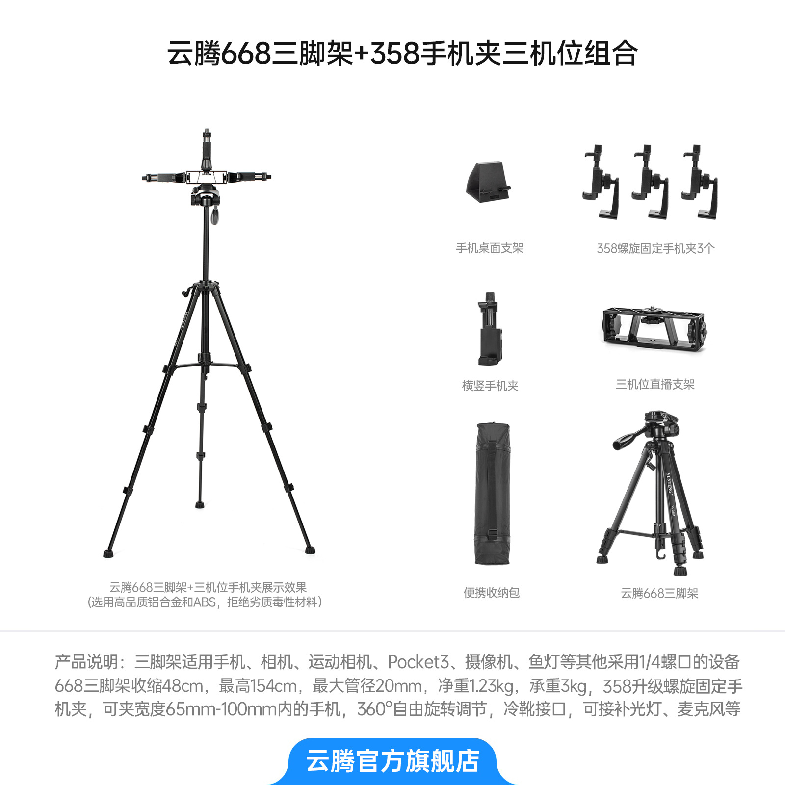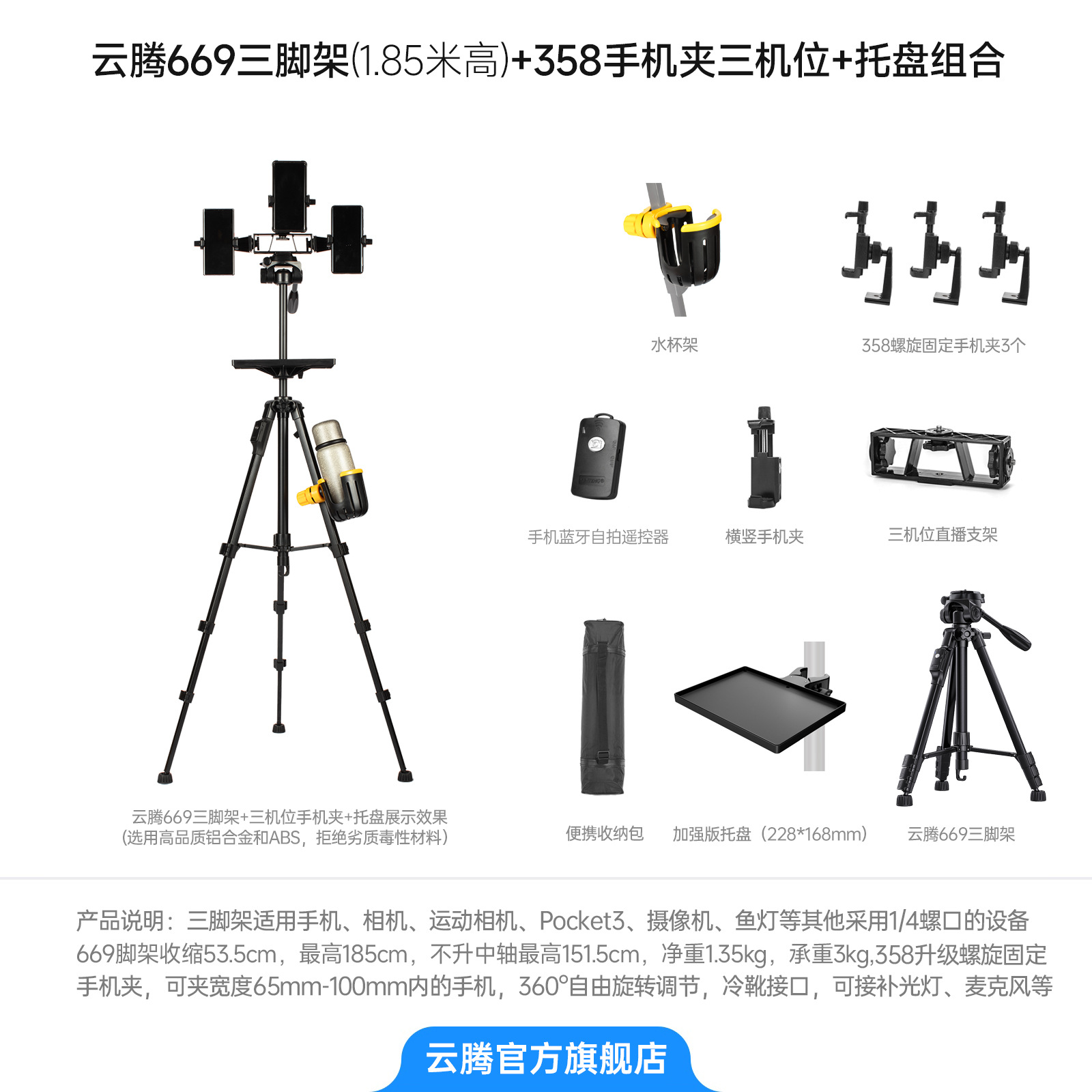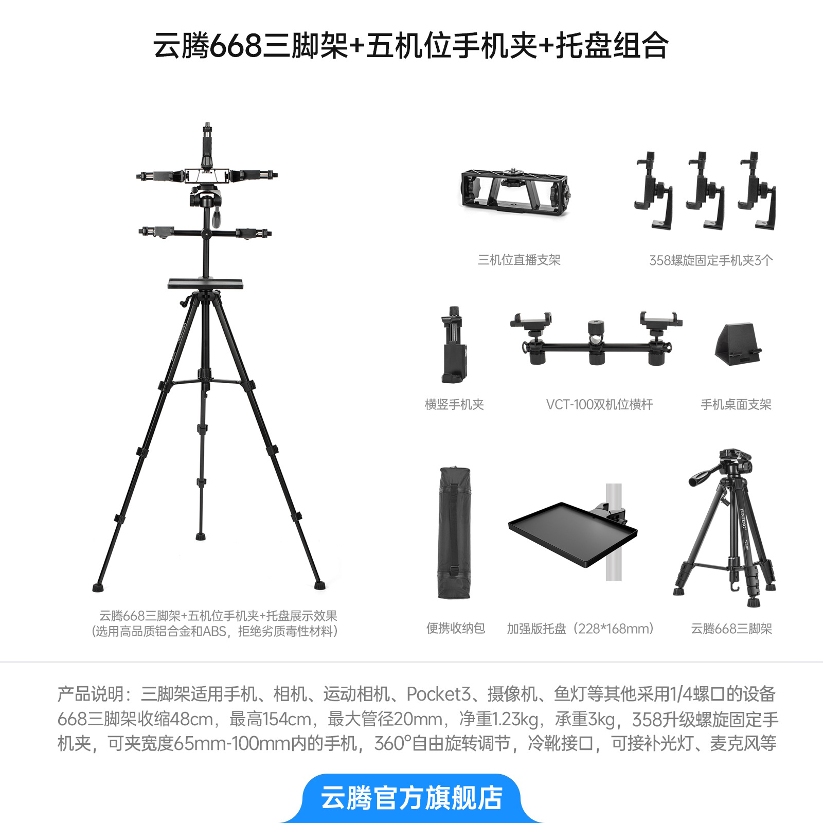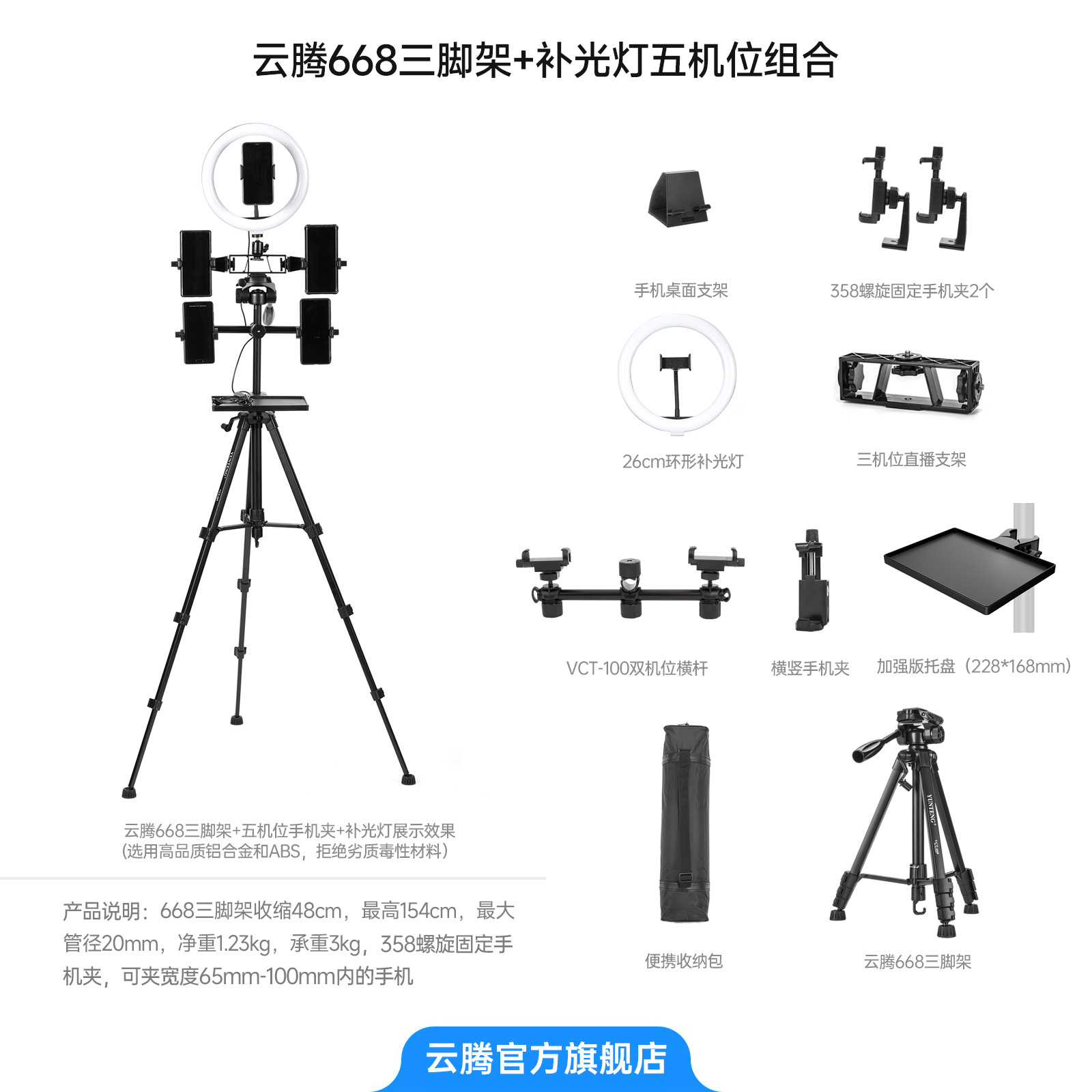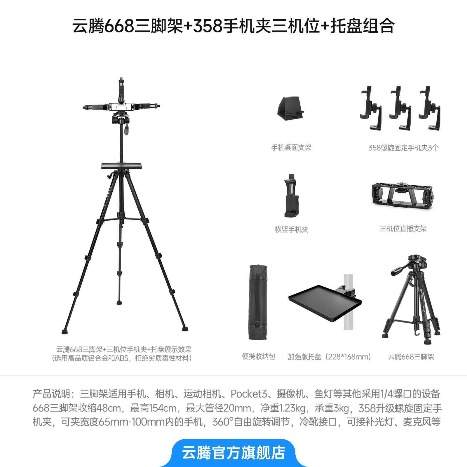 • [삼각대 2.208m 개] + 3위치 라이브 방송 스탠드 + 358 휴대폰 클립 3개 + 강화 트레이