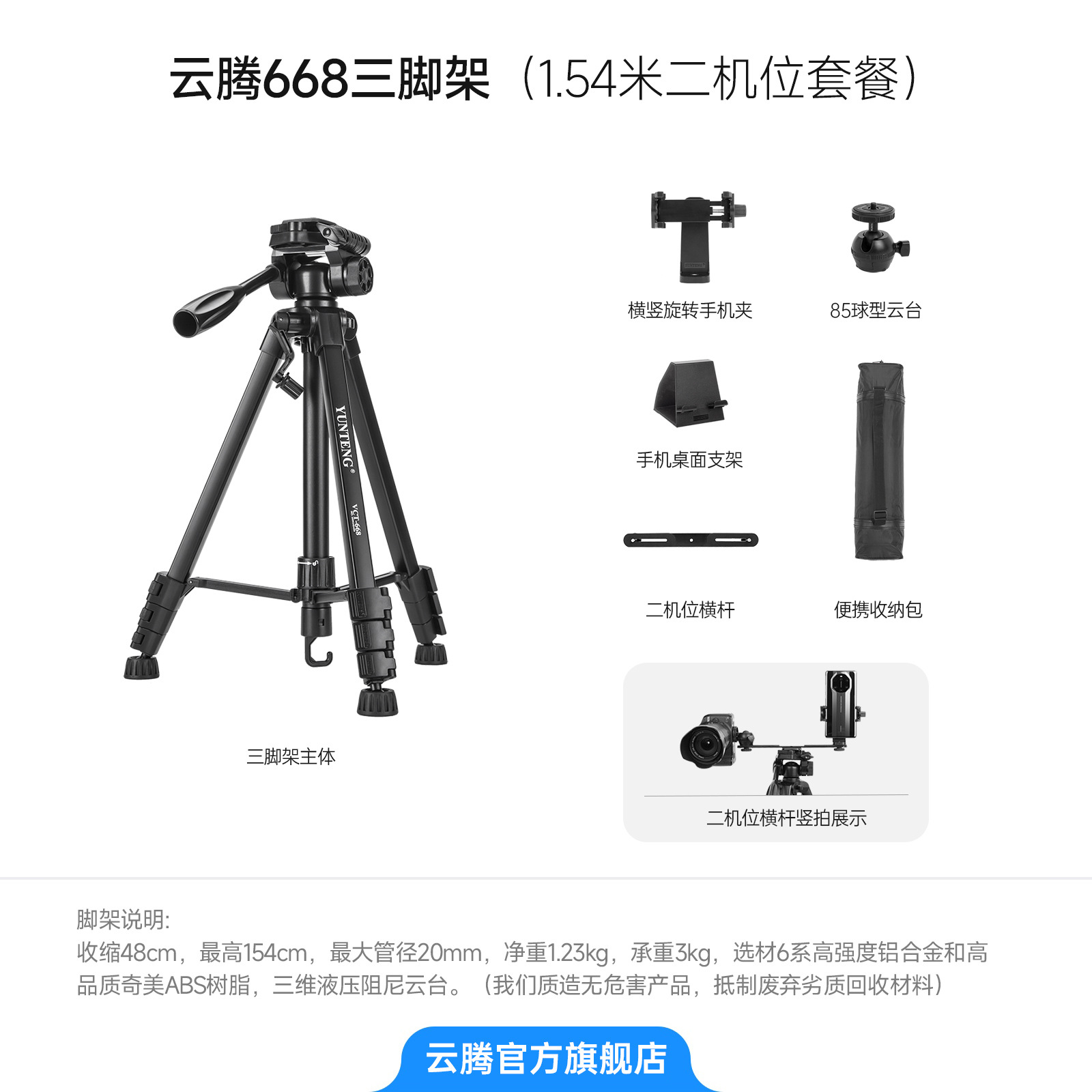 • [삼각대 2.208m 개] + 3위치 라이브 방송 스탠드 + VCT-100 확장 듀얼 위치 크로스바 + 358 휴대폰 클립 2개 + 강화 트레이
