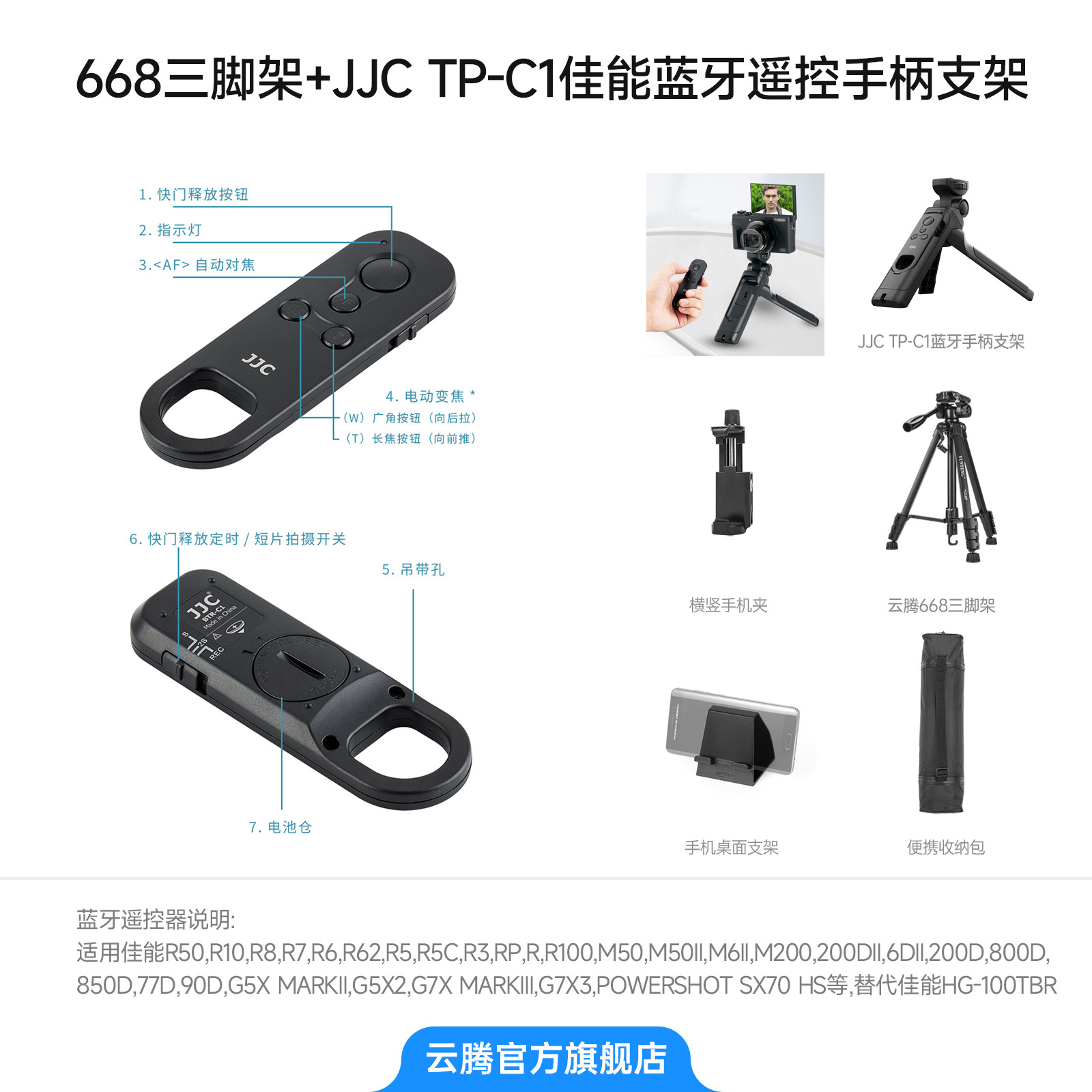 • [삼각대 2.208m 개] + JJC TP-C1 Canon 블루투스 리모컨 핸들 브래킷 + 보관 가방 + 수평 및 수직 휴대폰 클립 + 휴대폰 데스크탑 스탠드