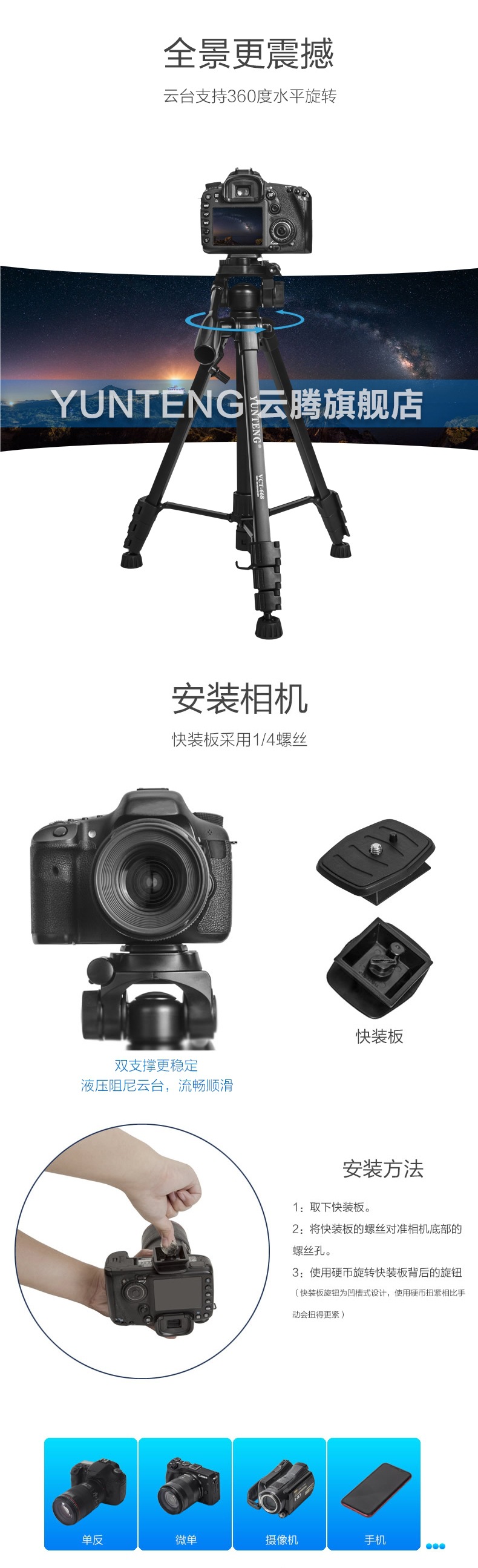 668 휴대용 유압 짐벌 삼각대 마이크로 SLR 카메라 휴대 전화 카메라 라이브 방송 바닥 스탠드 촬영 보조 조명스토어 가기