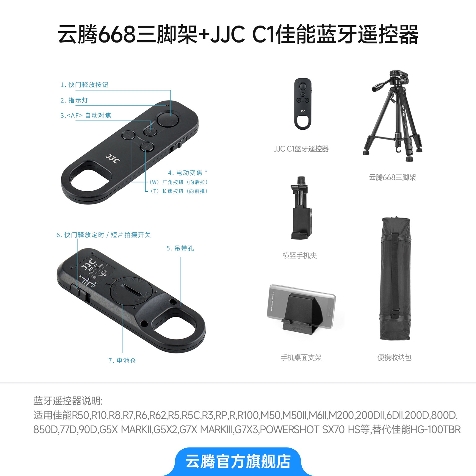• [삼각대 2.208m 개] + JJC-C1 Canon 블루투스 리모컨 + 보관 가방 + 수평 및 수직 휴대폰 클립 + 휴대폰 데스크탑 스탠드