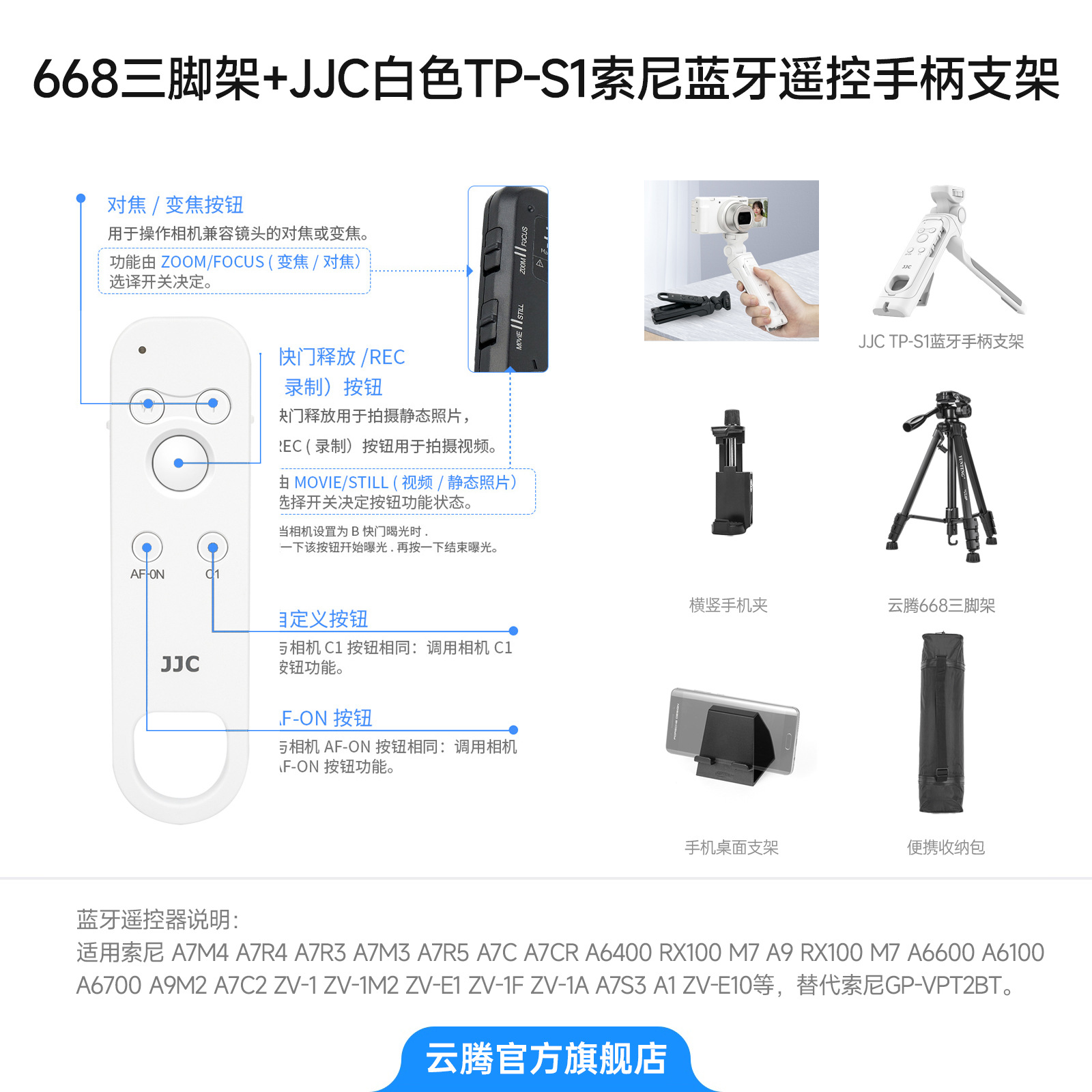 • [ 2.208m 삼각대 ] + JJC 화이트 S1 소니 블루투스 리모컨 + 수납가방 + 가로 및 세로 휴대폰 클립 + 휴대폰 데스크탑 스탠드