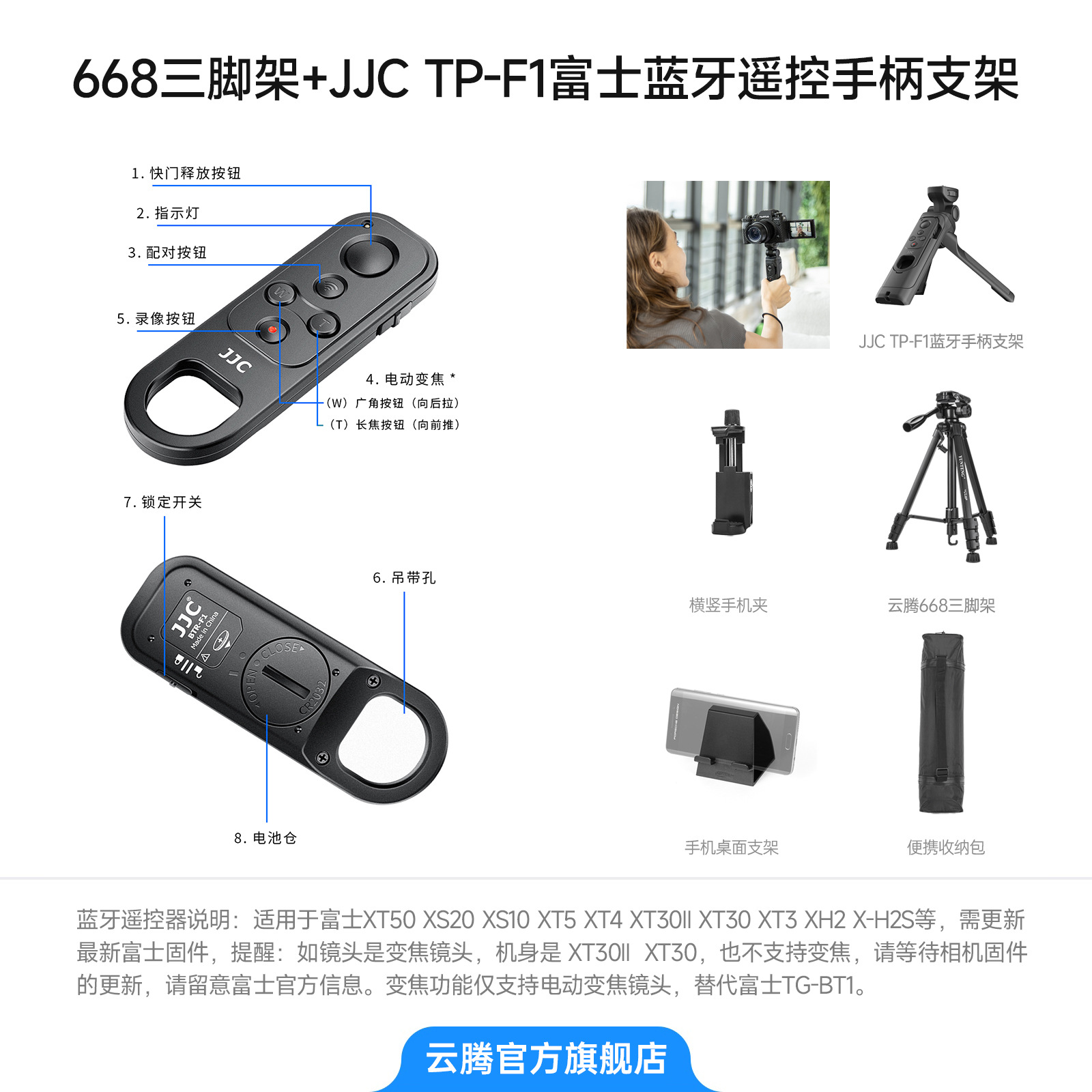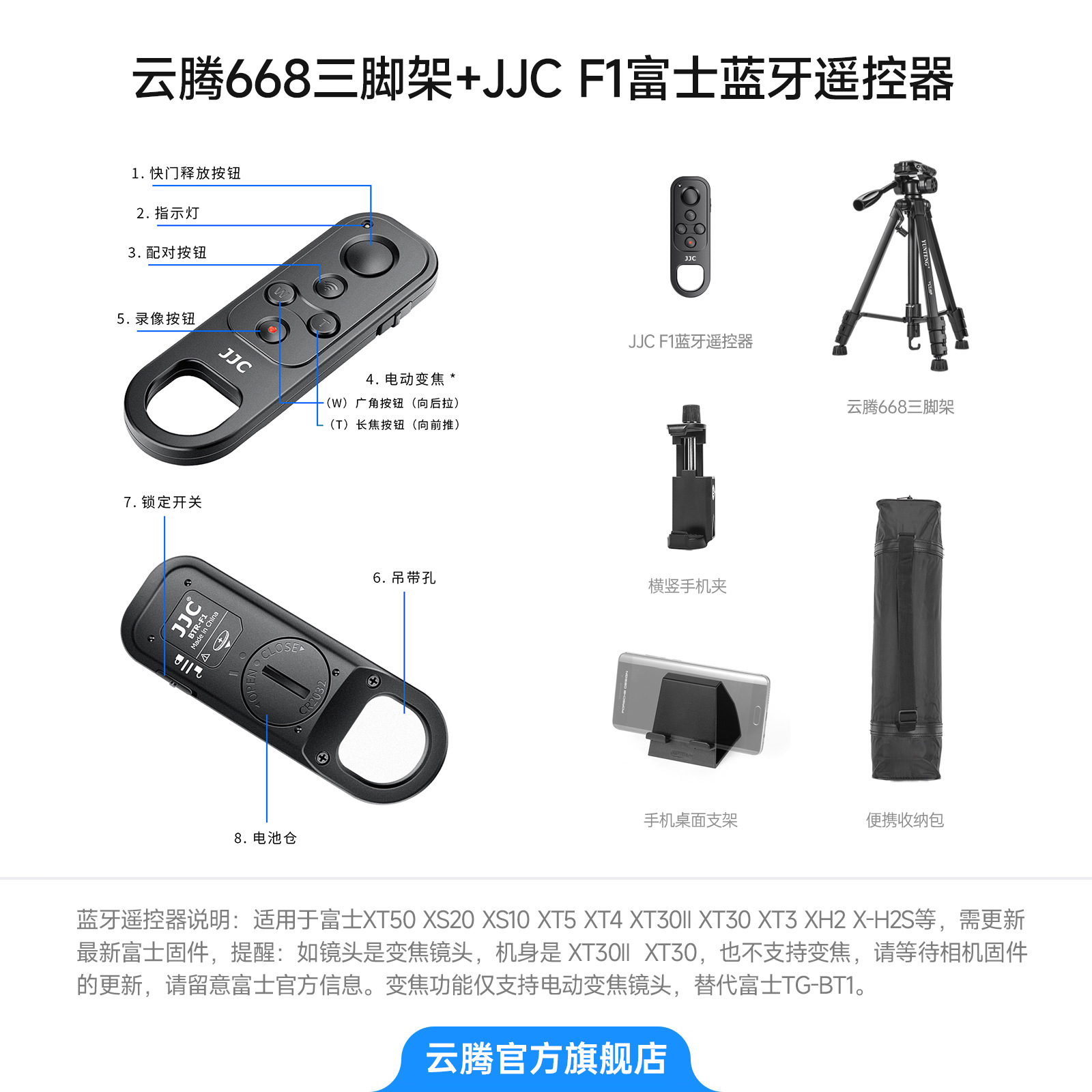 • [ 2.208m 삼각대 ] + JJC TP-F1 후지 블루투스 리모컨 손잡이 브래킷 + 가방 + 수평 및 수직 휴대폰 클립 + 휴대폰 데스크탑 브래킷