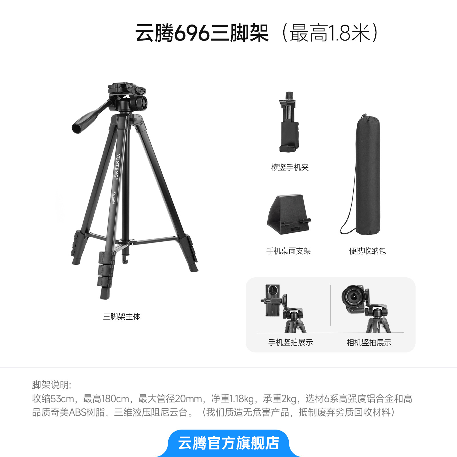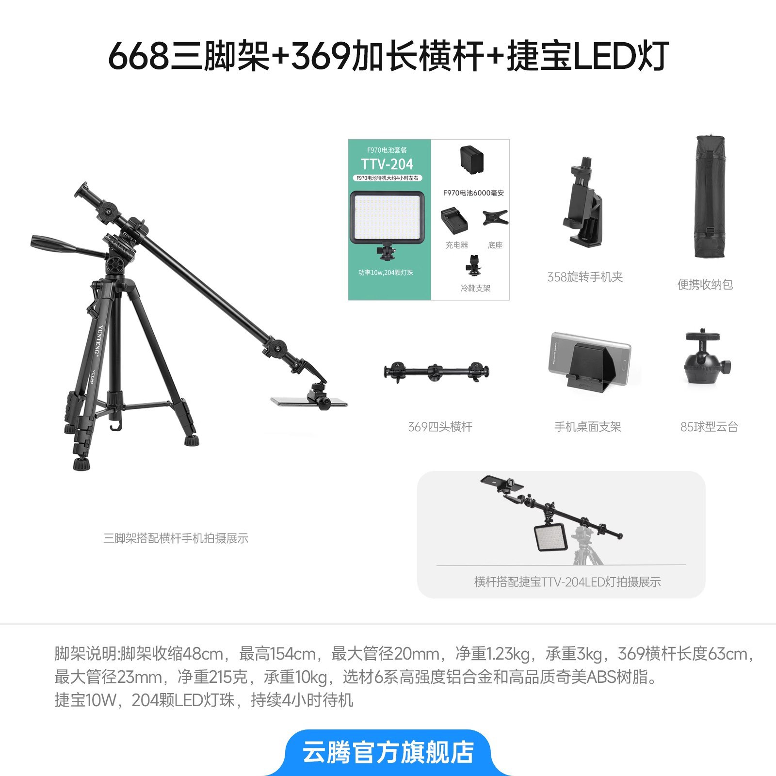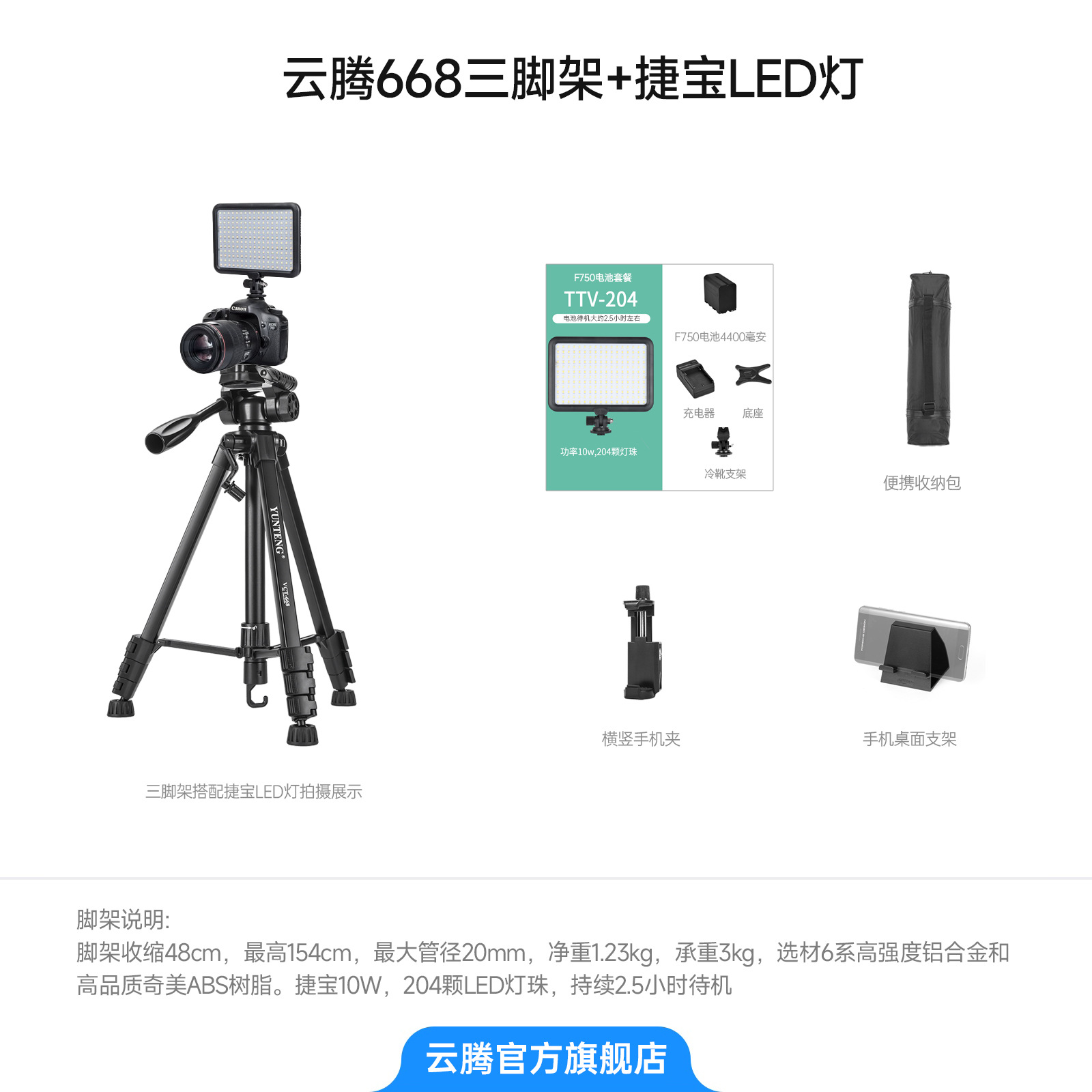 • 【 2.208m 】+Jiebao 204 필 라이트+F750 배터리+충전기+보관 가방+수평 및 수직 휴대폰 클립+데스크탑 스탠드