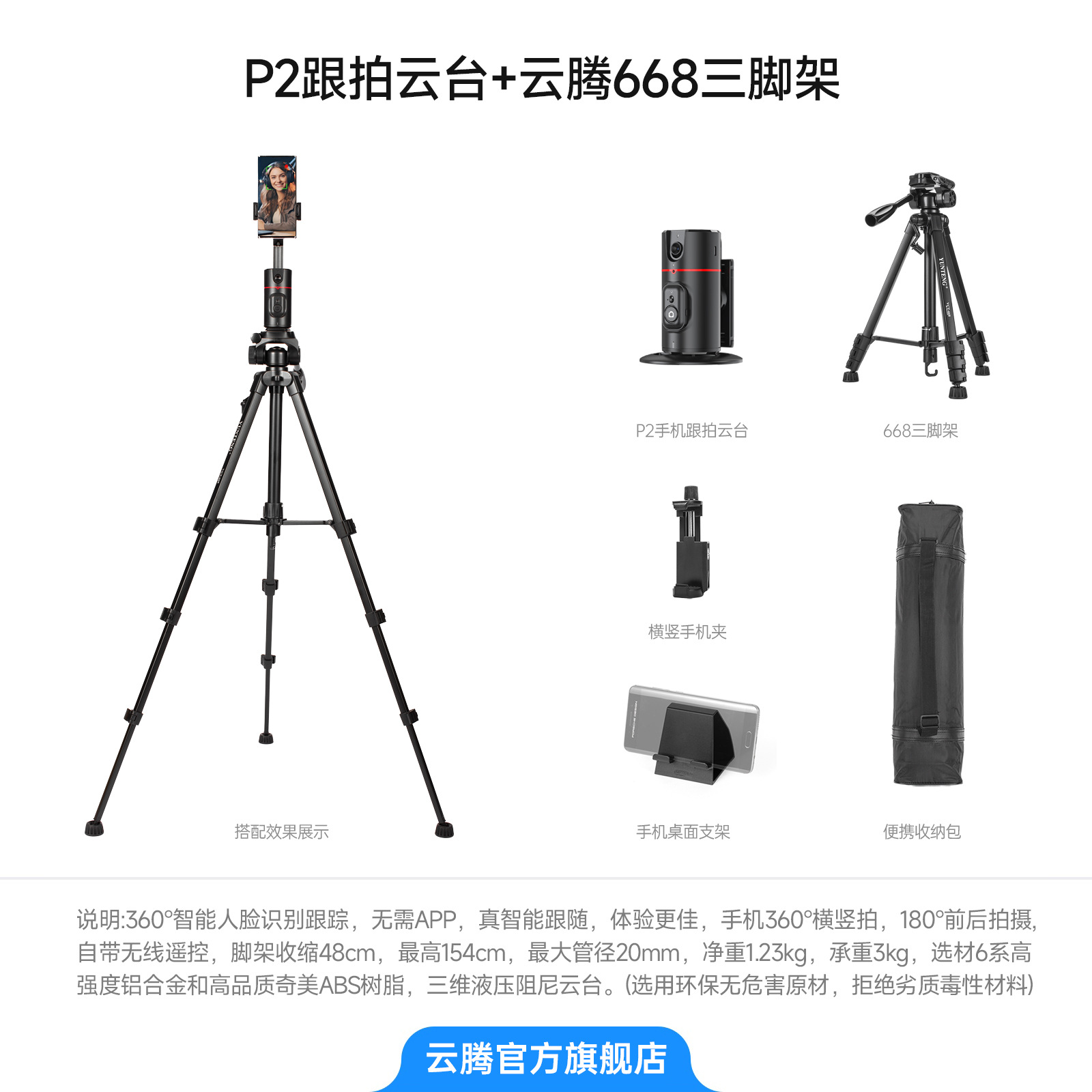 • [삼각대 2.208m 개] + 신제품 P2 추적 짐벌 블랙 + 무료 범용 리모콘 + 수평 및 수직 휴대폰 클립 + 휴대폰 데스크탑 스탠드