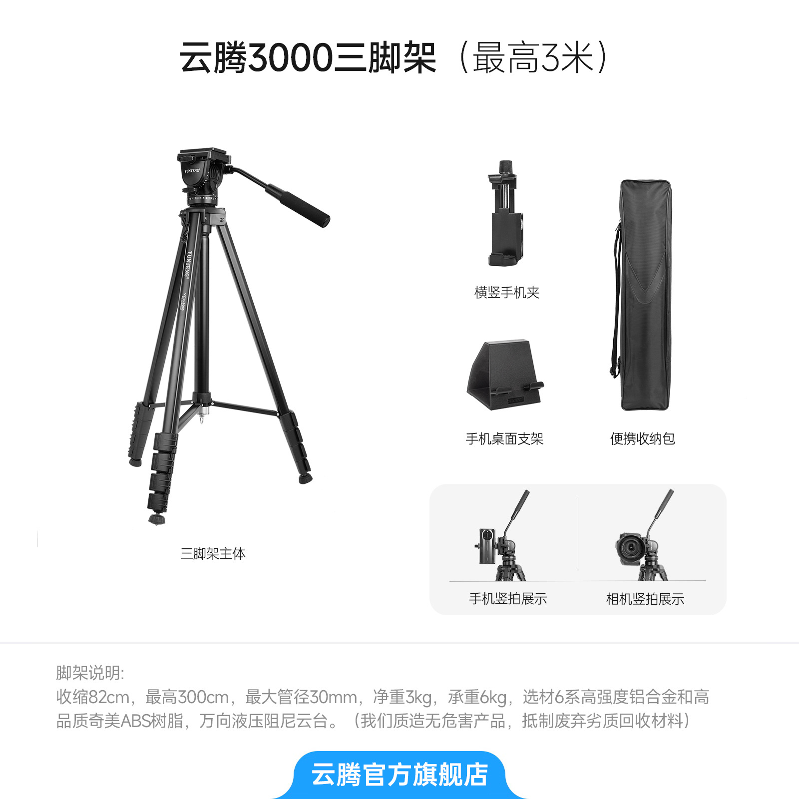• [ 3.059m 알루미늄 합금 - 전문 삼각대 - 더욱 안정적 - 높음 ] 보관 가방 + 수평 및 수직 휴대폰 클립 + 휴대폰 데스크탑 스탠드 포함