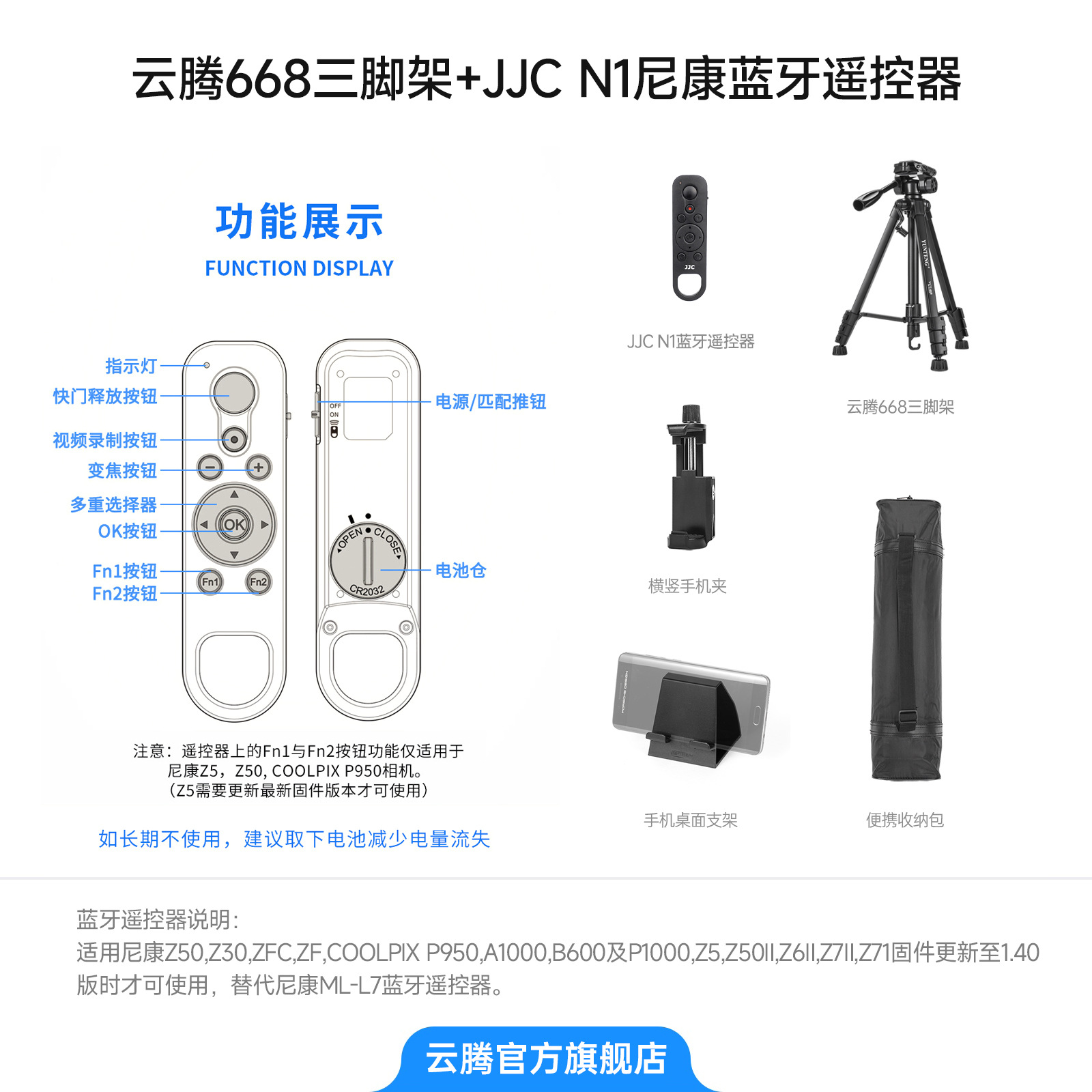 • [삼각대 2.208m 개] + JJC N1 Nikon 블루투스 리모컨 + 보관 가방 + 수평 및 수직 휴대폰 클립 + 휴대폰 데스크탑 스탠드