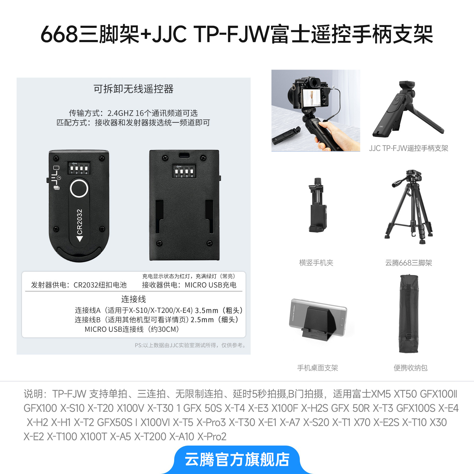 • [삼각대 2.208m 개] + JJC TP-FJW 후지 리모콘 손잡이 + 보관 가방 + 수평 및 수직 휴대폰 클립 + 휴대폰 데스크탑 스탠드