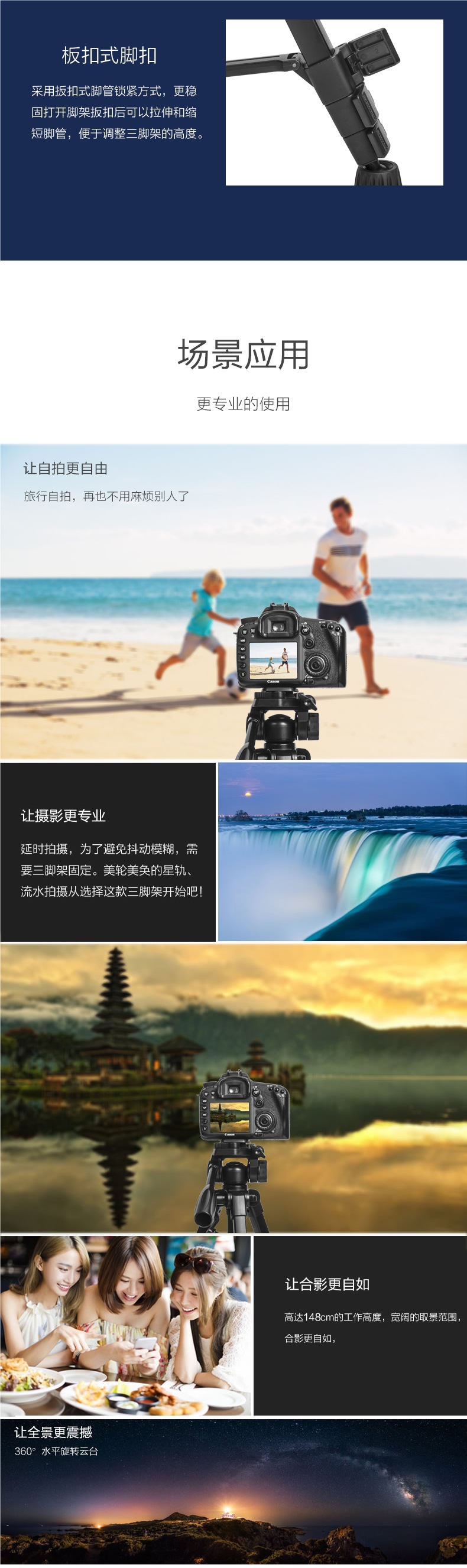 • [삼각대 2.208m 개] + 카메라 위치 크로스바 2개 + 85도 볼 헤드 + 수평 및 수직 촬영용 회전 휴대폰 클립 + 보관 가방 + 휴대폰 데스크탑 스탠드