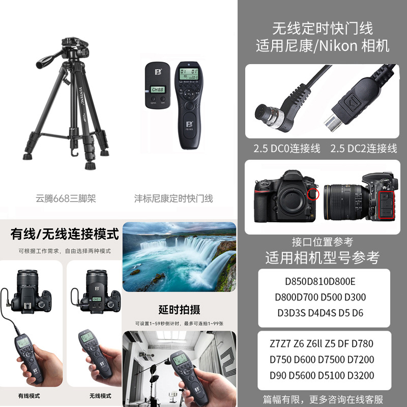 • [삼각대 2.208m 개] + Fengbiao Nikon 무선 타이밍 셔터 케이블 + 보관 가방 + 수평 및 수직 휴대폰 클립 + 휴대폰 데스크탑 스탠드