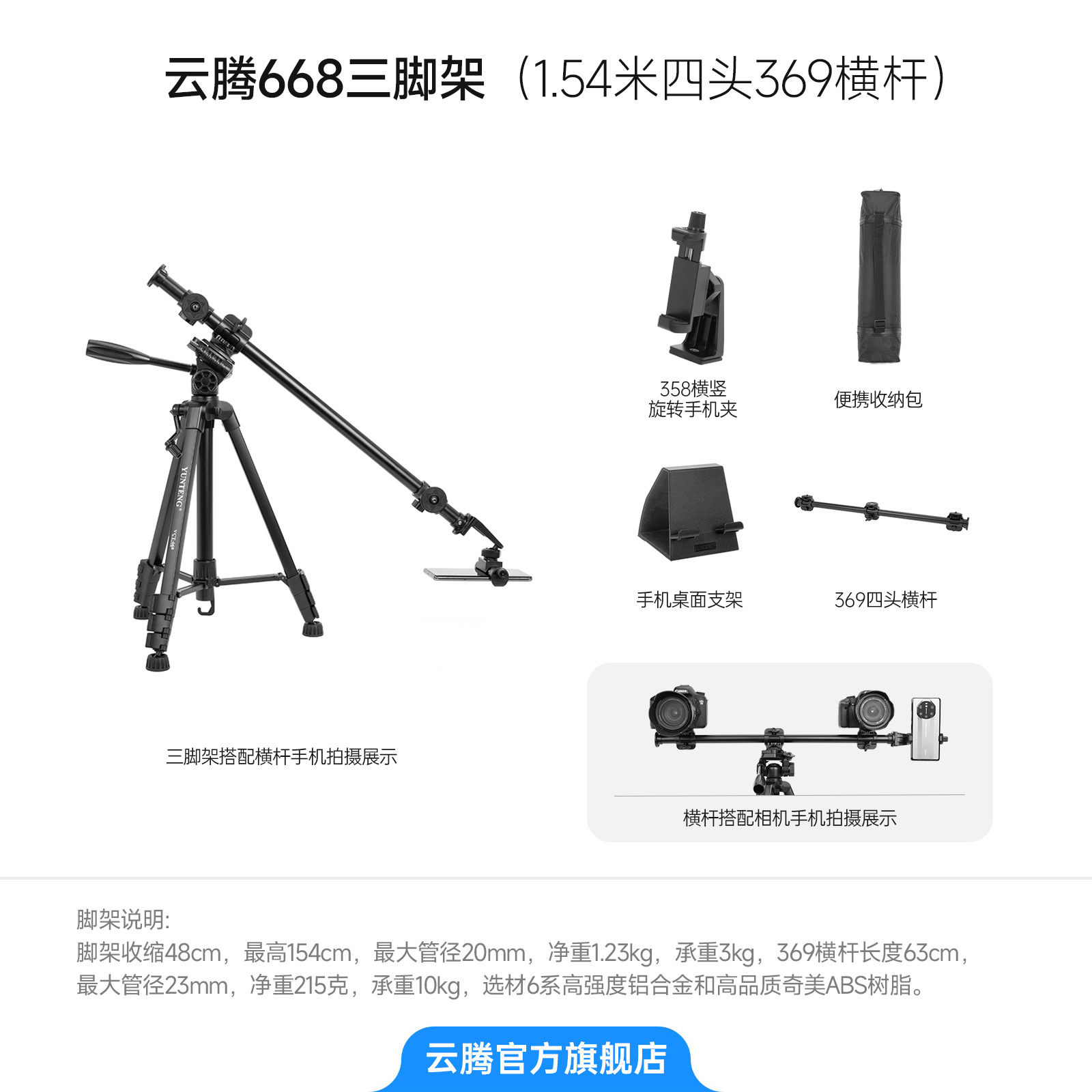 • [삼각대 2.208m 개] + 생방송 오버헤드 샷용 369 확장 크로스바 + 358 수평 및 수직 휴대폰 클립 + 보관 가방 포함 + 휴대폰 데스크탑 스탠드