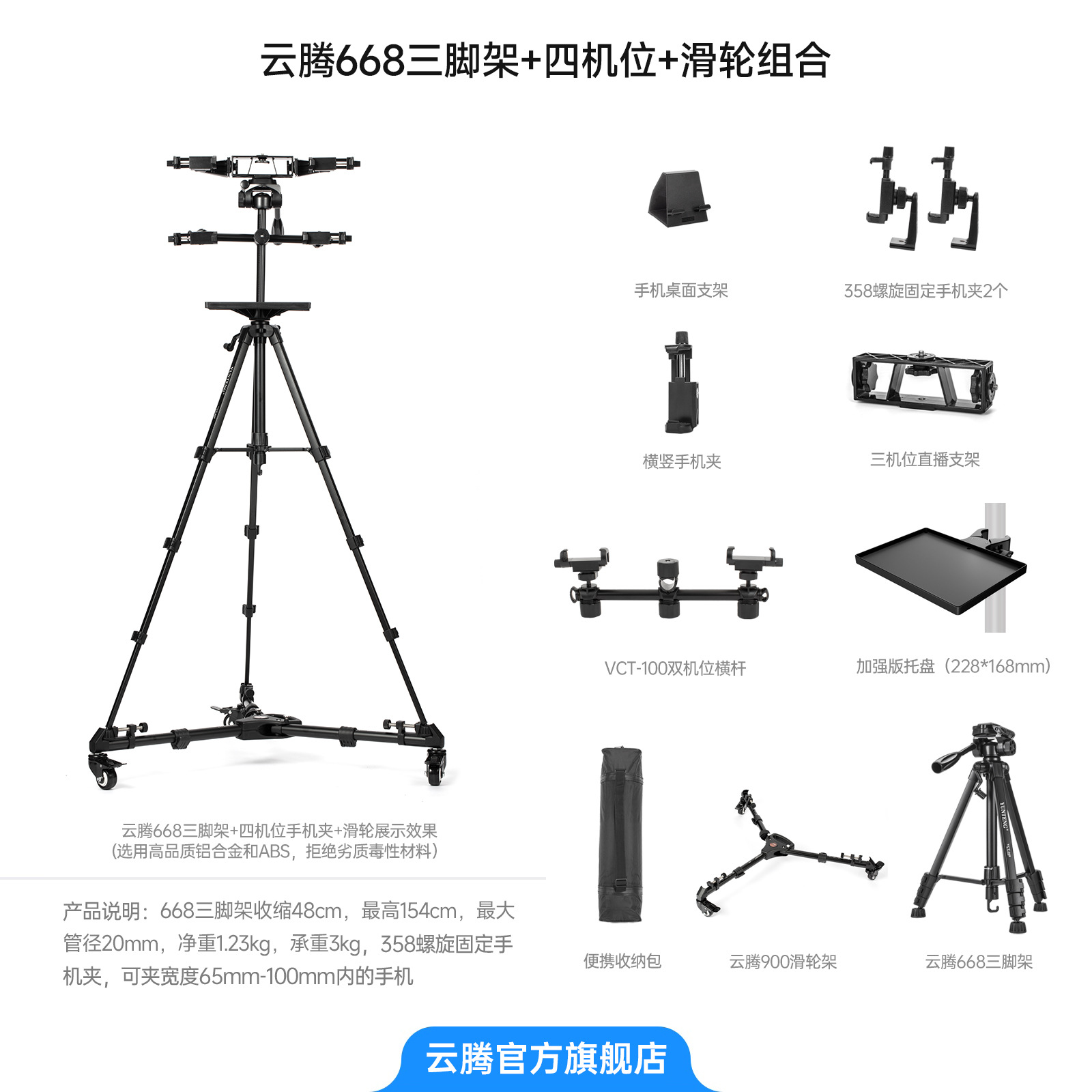 • [삼각대 2.208m 개] + 3위치 라이브 방송 스탠드 + VCT-100 확장 듀얼 위치 크로스바 + 358 휴대폰 클립 3개 + 강화 트레이