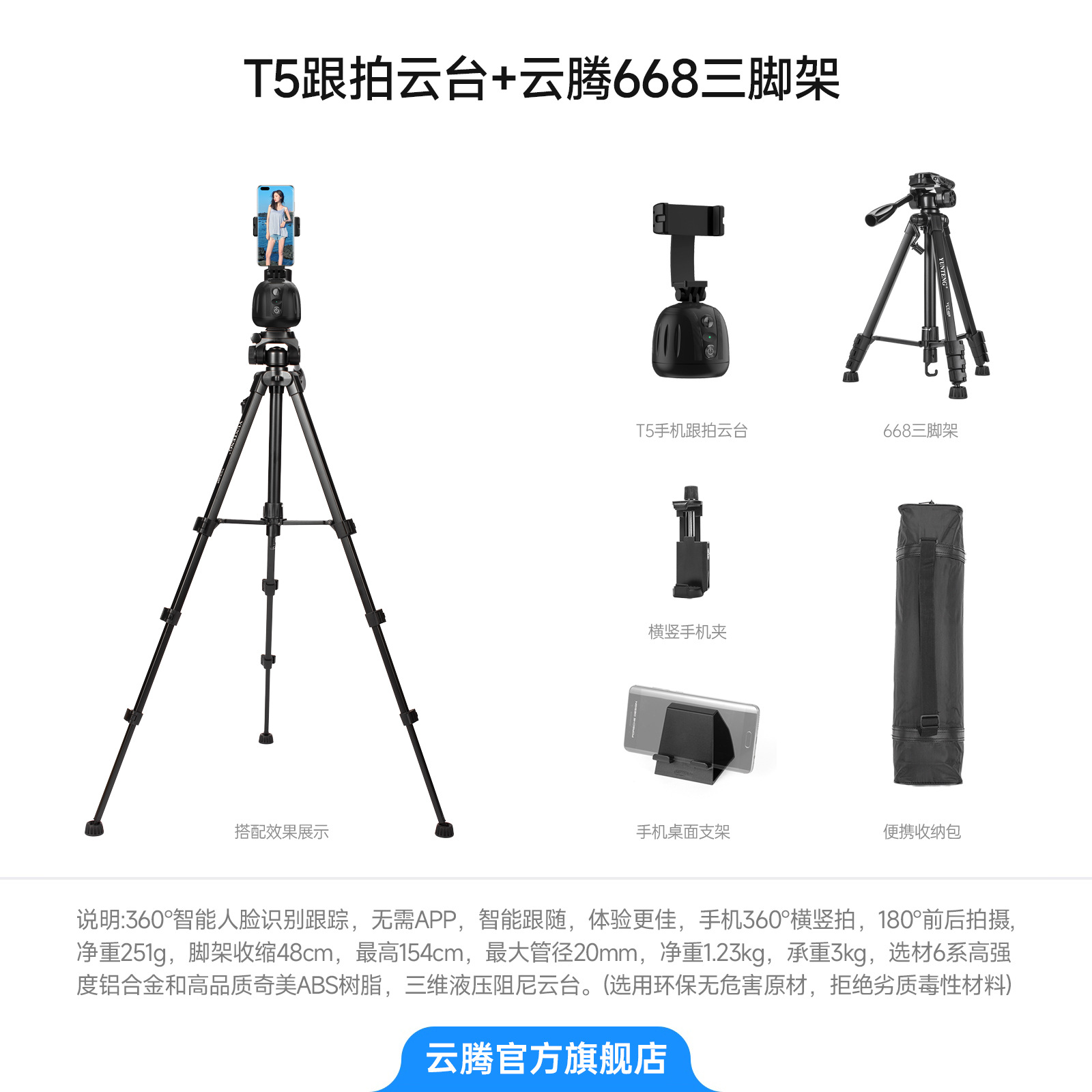 • [삼각대 2.208m 개] + 검정색 T5 추적 짐벌 + 수평 및 수직 휴대폰 클립 + 휴대폰 데스크탑 스탠드